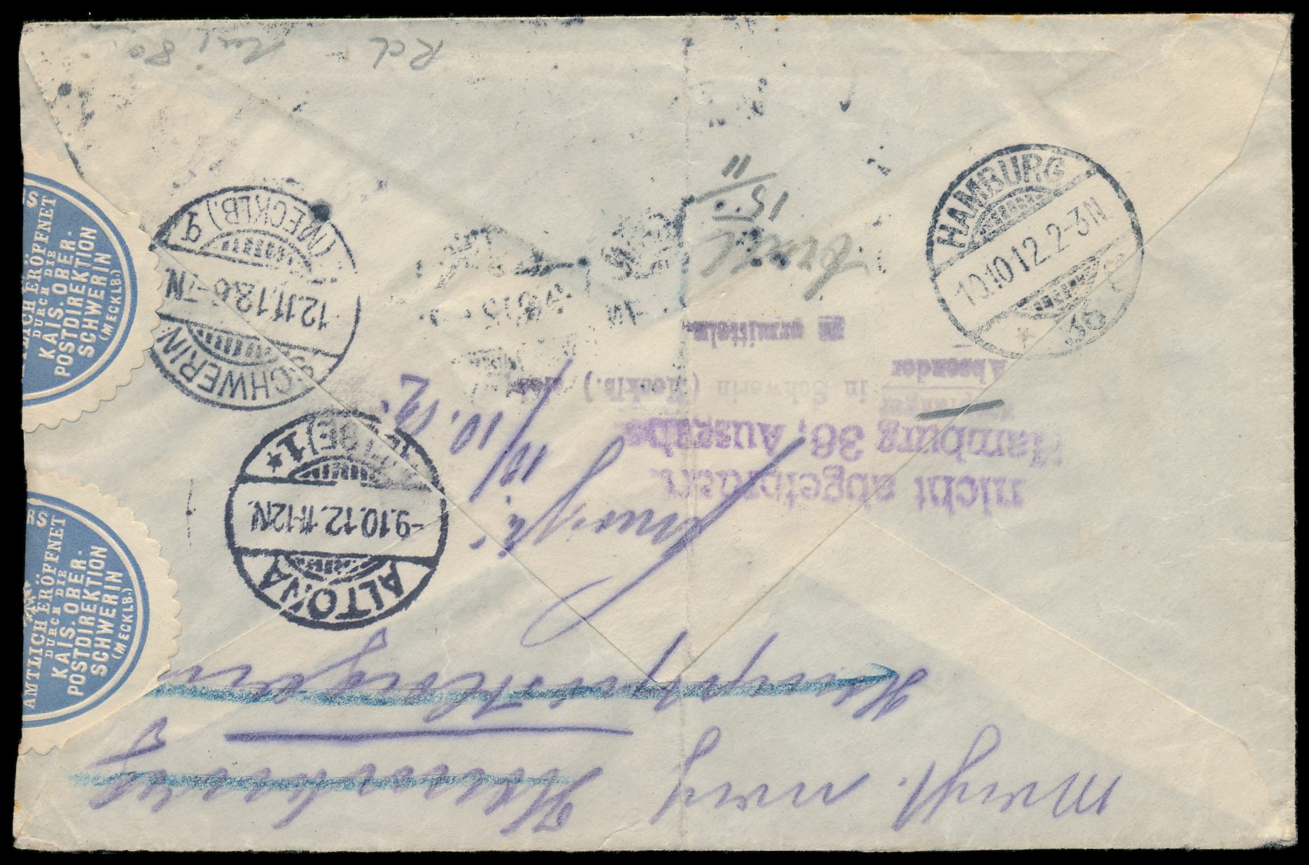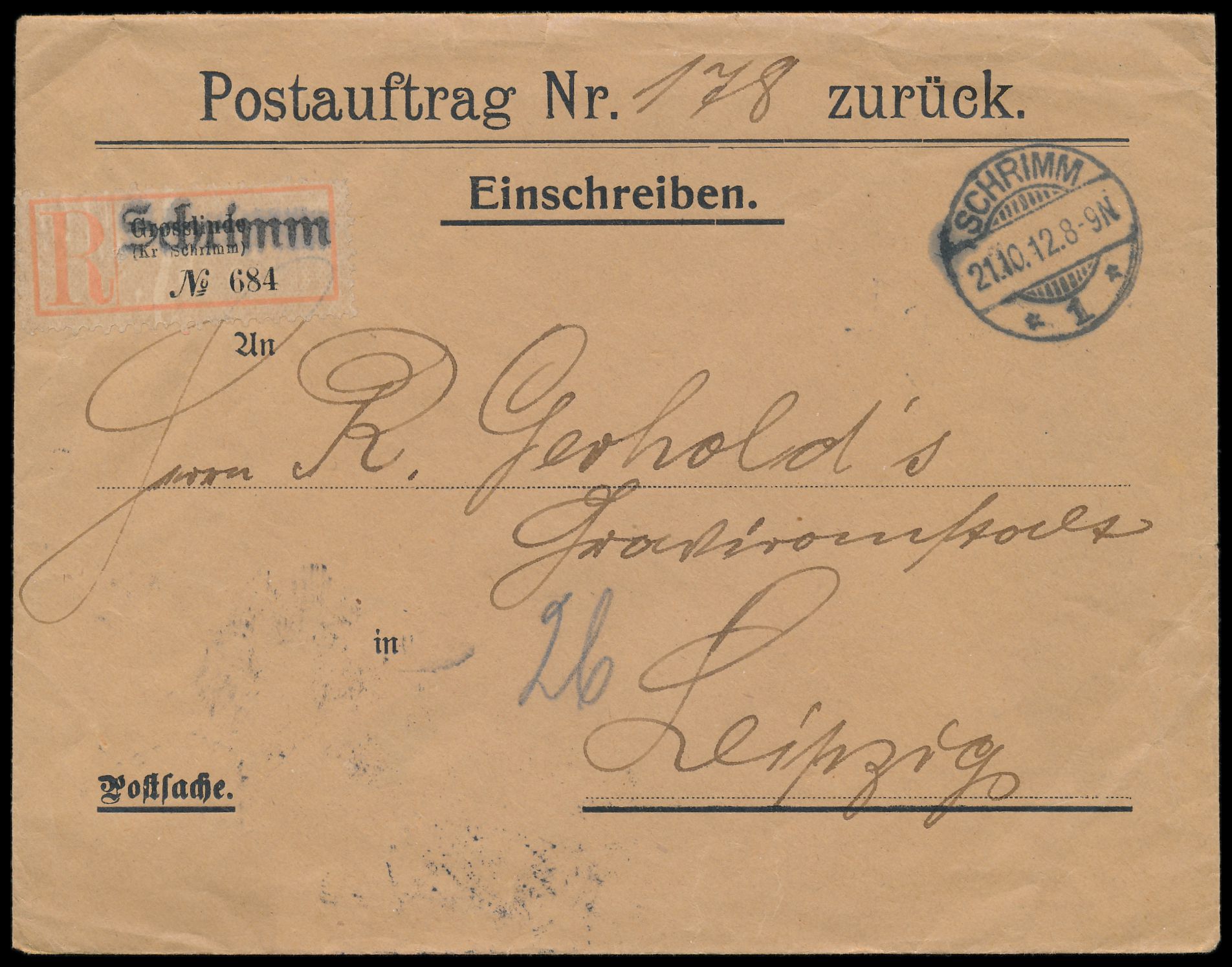 Vordruckumschlag Postauftrag Nr. ... zurück" als Einschreiben-Postsache nach Leipzig, Stempel Schrimm 21.10.12, R-Zettel Grosslinde (Kr. Schrimm) mit schwarzem Orts-L1 Schrimm überstempelt, Ankunftstempel 22.10.12