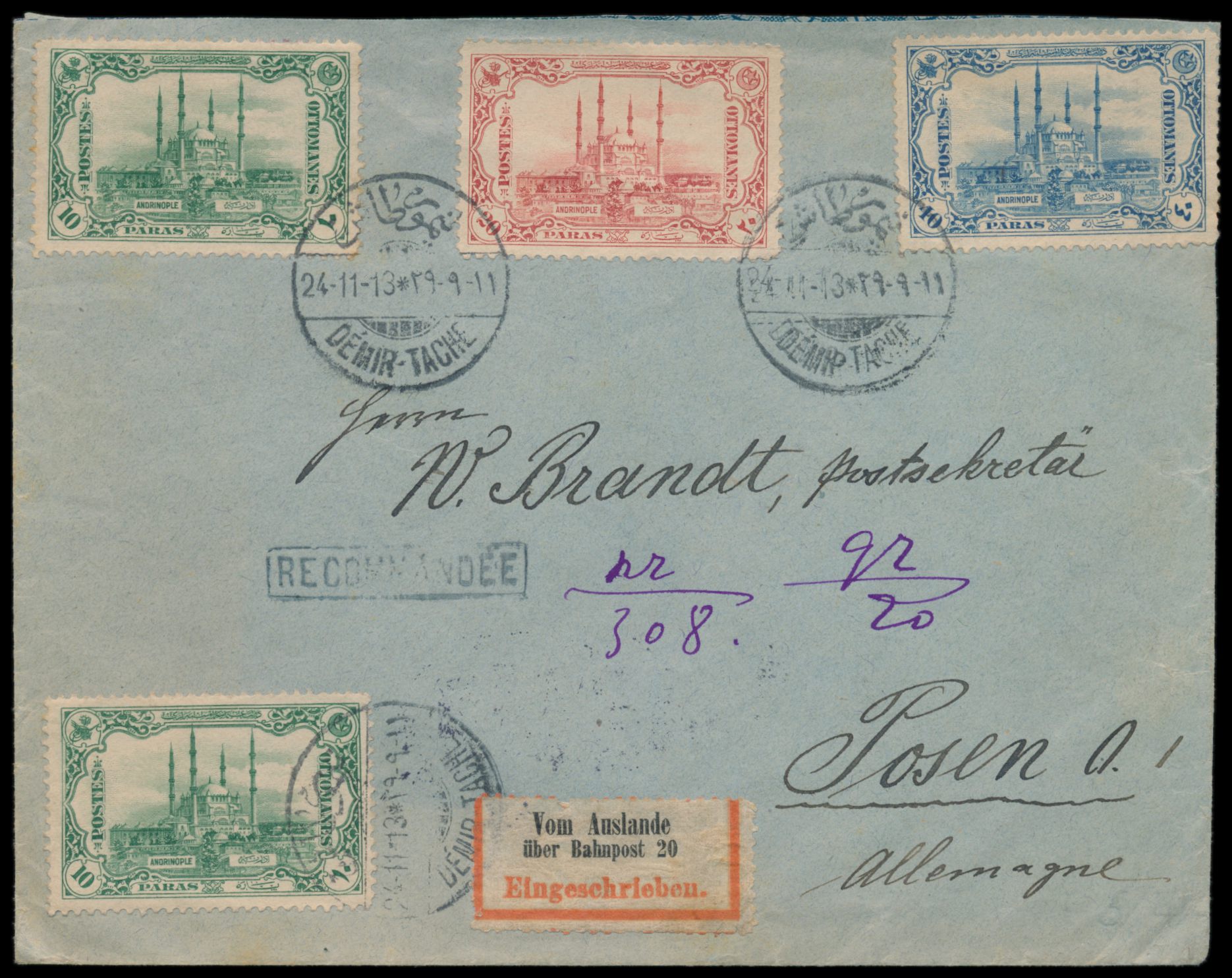 Türkei: Andrianopel-Satz und zusätzlich weitere 10 Pa. portorichtig auf Einschreibbrief mit Stempel Demir-Tache 24.11.13 nach Deutschland, Rahmenstempel Recommandée und handschriftliche Registriernummer, R-Zettel "Vom Auslande über Bahnpost 20" (ohne "R"), rückseitig Bahnpoststempel Dresden - Tetschen Zug 51 28.11.15, Ankunftstempel Posen 28.11.13
