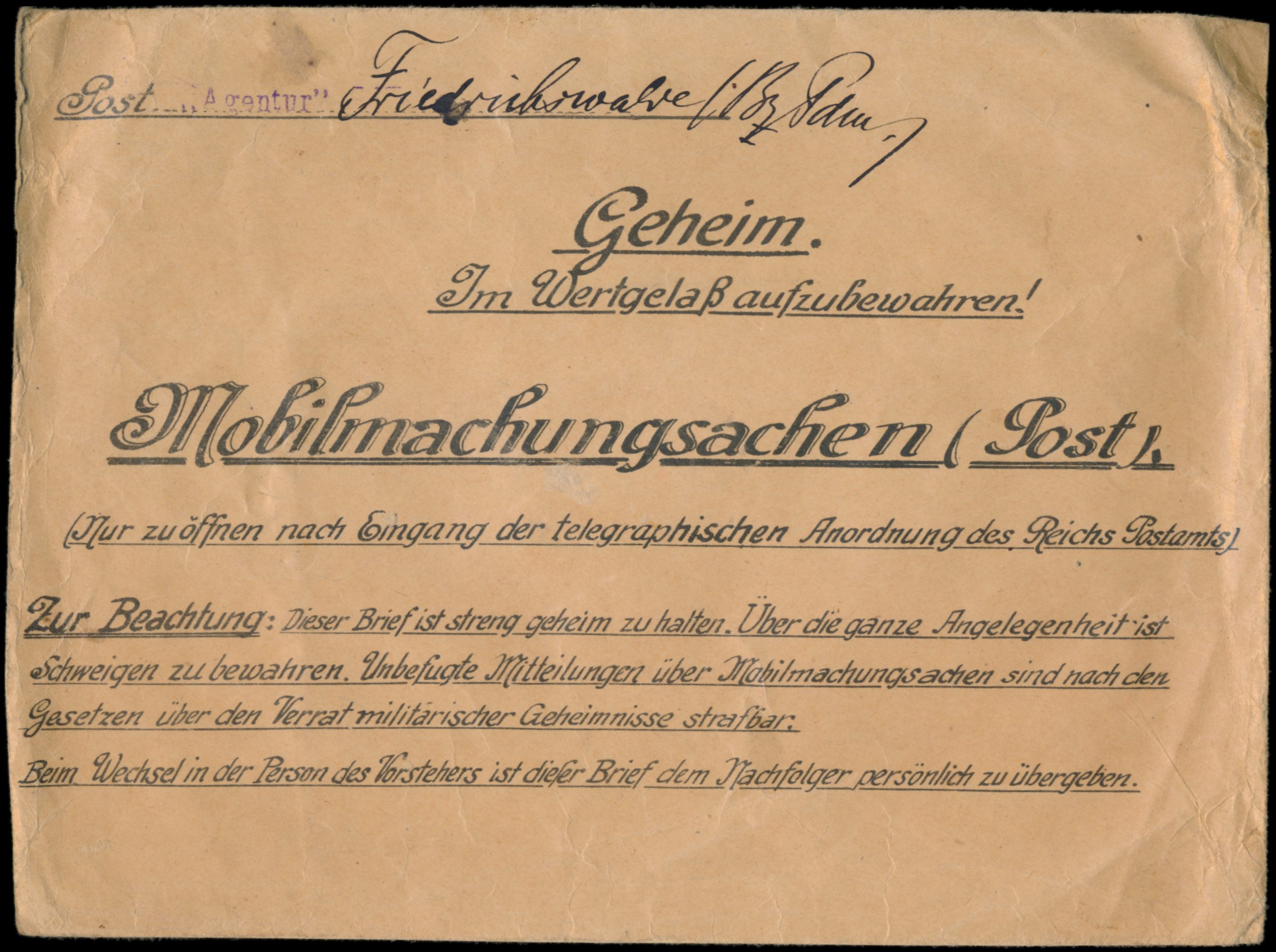 August 1914, großformatiger Vordruckumschlag (22,2 x 16,5 cm) "... Mobilmachungssachen (Post) (Nur zu öffnen nach Eingang der telegraphischen Anordnung des Reichs-Postamts) ...", rückseitig rotes Lacksiegel "Kaiserlich Deutsche Ober-Postdirektion Potsdam", für Postagentur Friedrichswalde (Bz. Potsdam)