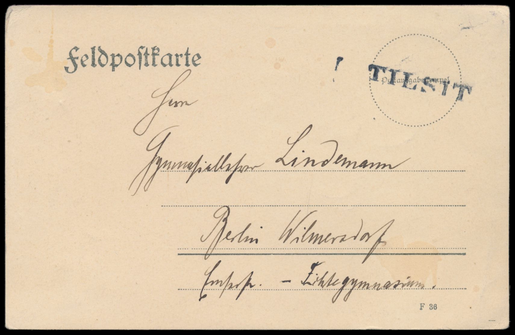 alter Formularstempel L1 Tilsit als Notaufgabestempel für den während der russischen Besetzung in Verlust geratenen Tagesstempel auf Feldpostkarte nach Berlin, geschrieben am 16.9.1914, Text "Sende Ihnen nach der am 12. u.13. Sept. erfolgten Einnahme der schönen Stadt Tilsit viele Grüße ...", interessante Beschreibung der Ereignisse in Tilsit, Bedarf