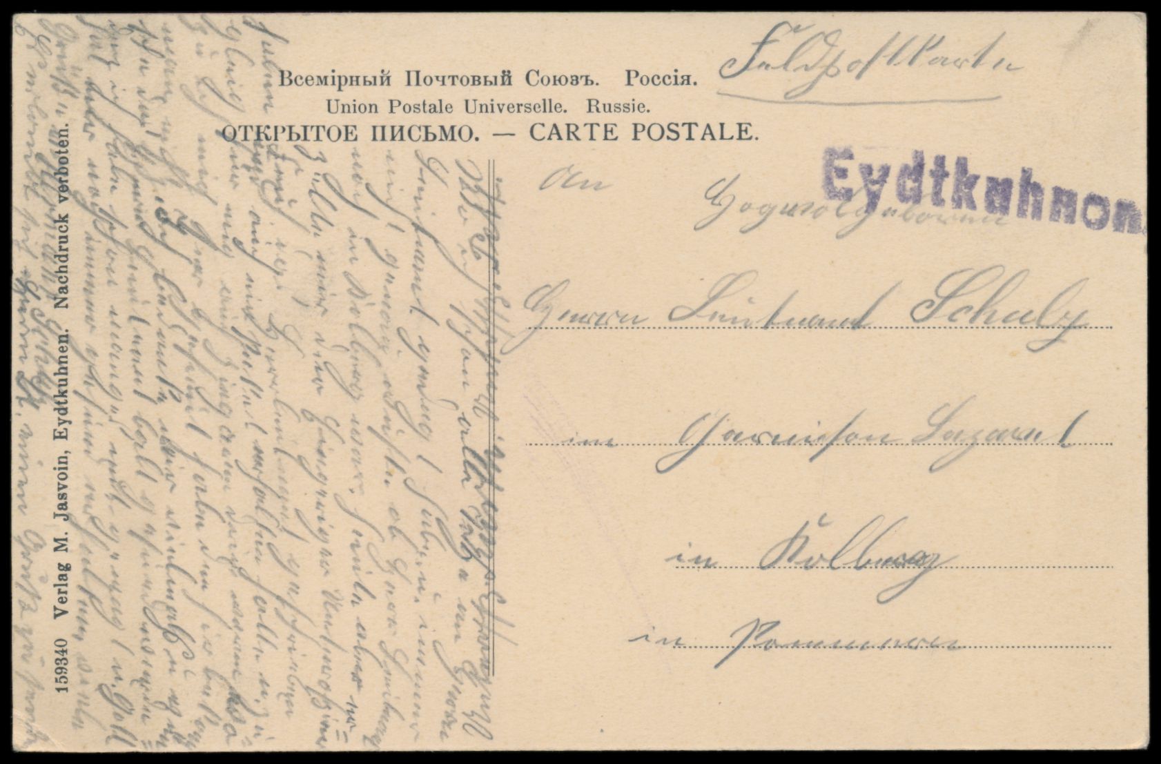 violetter Not-L1 Eydtkuhnen auf Feldpostkarte (Ansichtskarte des russischen Kommandeurs in Eydtkuhnen, Verlag M. Jasvoin, Eydtkuhnen) nach Kolberg, nach der Befreiung Ostpreußens nach dem Russeneinfall 1914, Bedarf