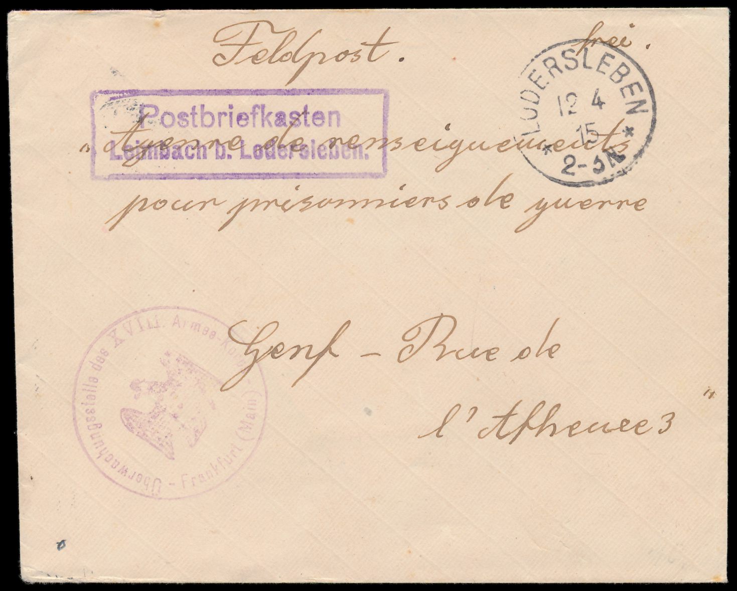 unfrankierter Brief an das Kriegsgefangenen-Auskunftsbüro in Genf mit Angabe "Feldpost", violetter R2 Postbriefkasten Leimbach b. Lodersleben und K1 Lodersleben 12.4.15, violetter Zensurstempel Frankfurt / Main, Bedarf