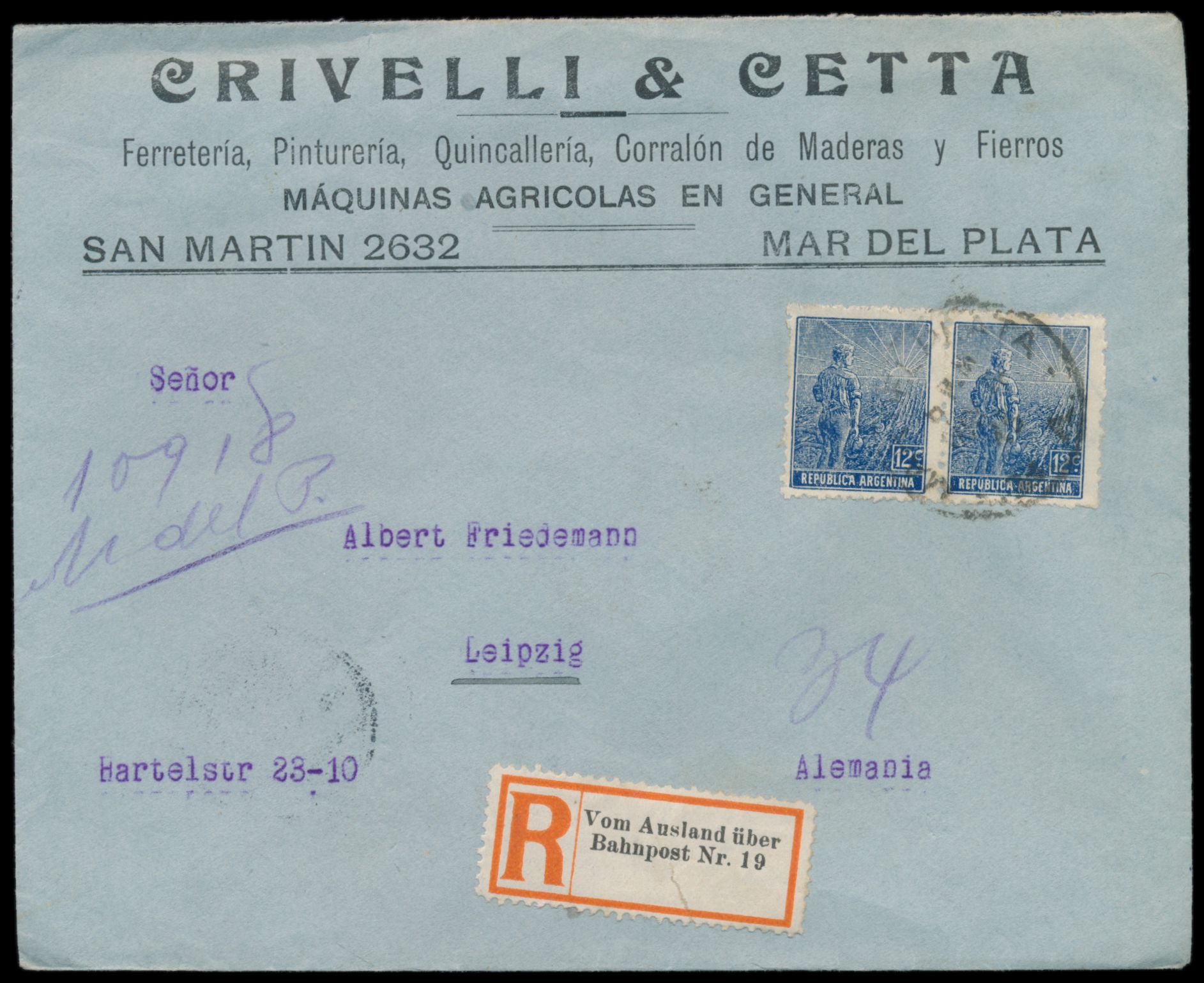 2 x Argentinien 12 C. auf Einschreibbrief mit Stempel Mar del Plata 4.5.15 nach Deutschland, handschriftlicher R-Vermerk, Durchgangsstempel Buenos Aires 5.5.1915, R-Zettel "Vom Ausland über Bahnpost 19" , Ankunftstempel Leipzig 1.6.15, Bedarf