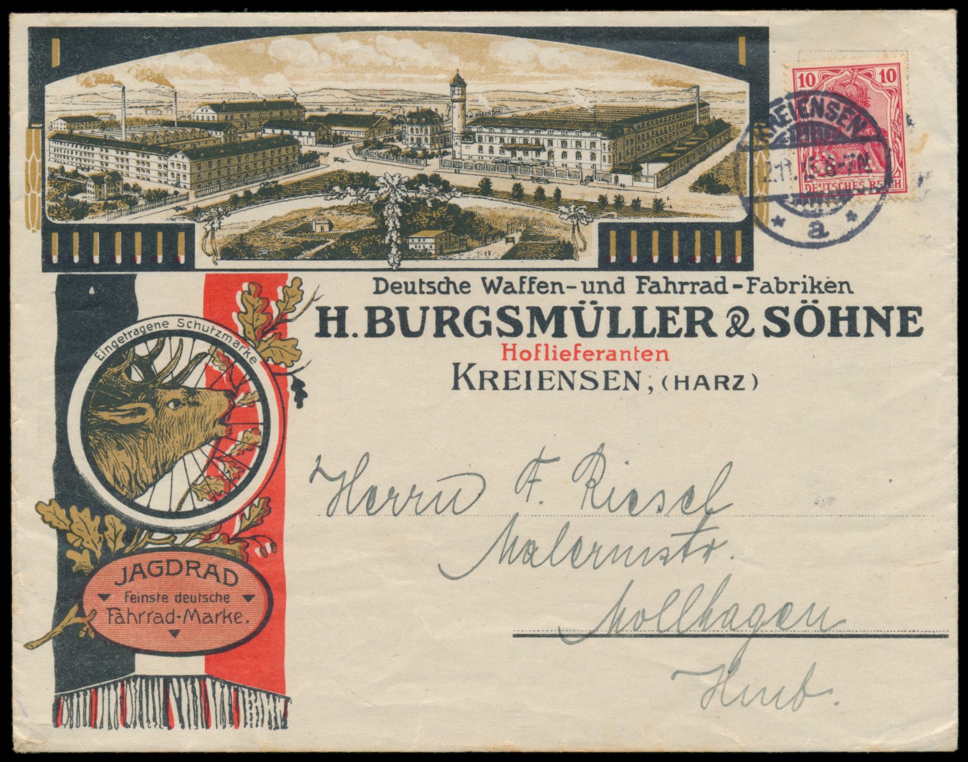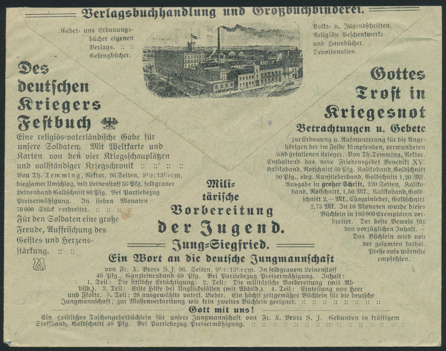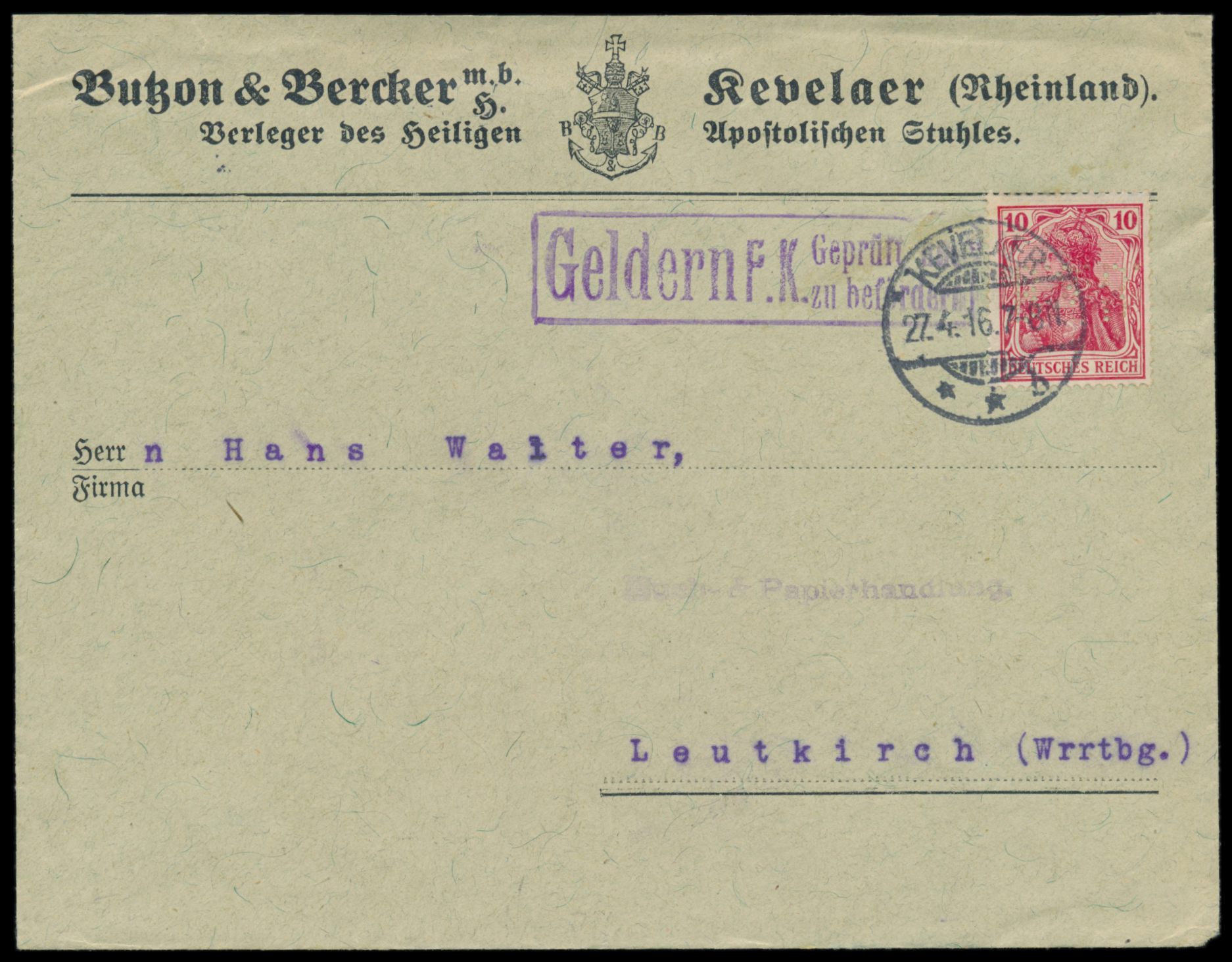 10 Pfg. Germania auf Firmenbrief Butzon & Bercker Verleger des Heiligen Apostolischen Stuhls, Stempel Kevelaer 27.4.16, Marke Firmenlochung B&B, Zensurstempel Geldern, Bedarf nach Leutkirch, rückseitig Reklame mit Bild der Firma, selten