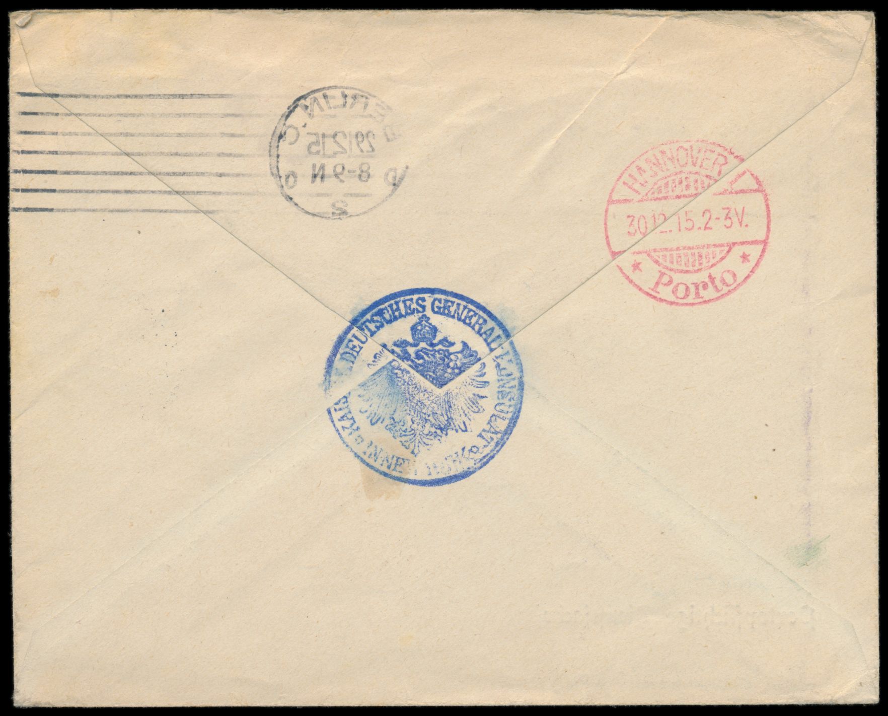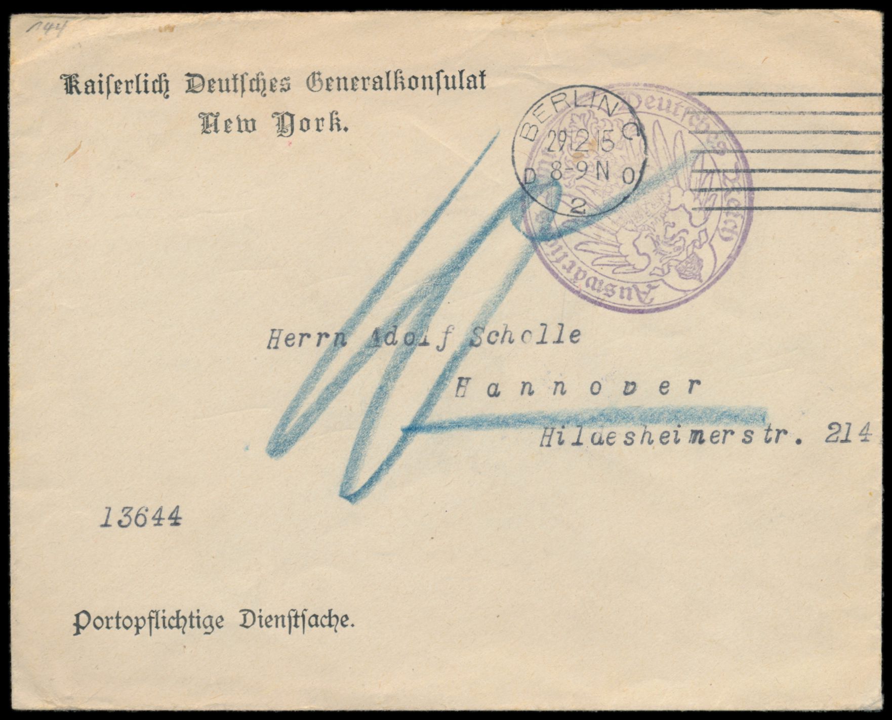 Brief "Portopflichtige Dienstsache" des Kaiserlich Deutschen Generalkonsulats New York, violettes Dienstsiegel Deutsches Reich Auswärtiges Amt, Maschinenstempel Berlin C 2 29.12.15, nach Hannover, roter Ankunftstempel Hannover 1 Porto 30.12.15, Nachgebühr 10 Pf.