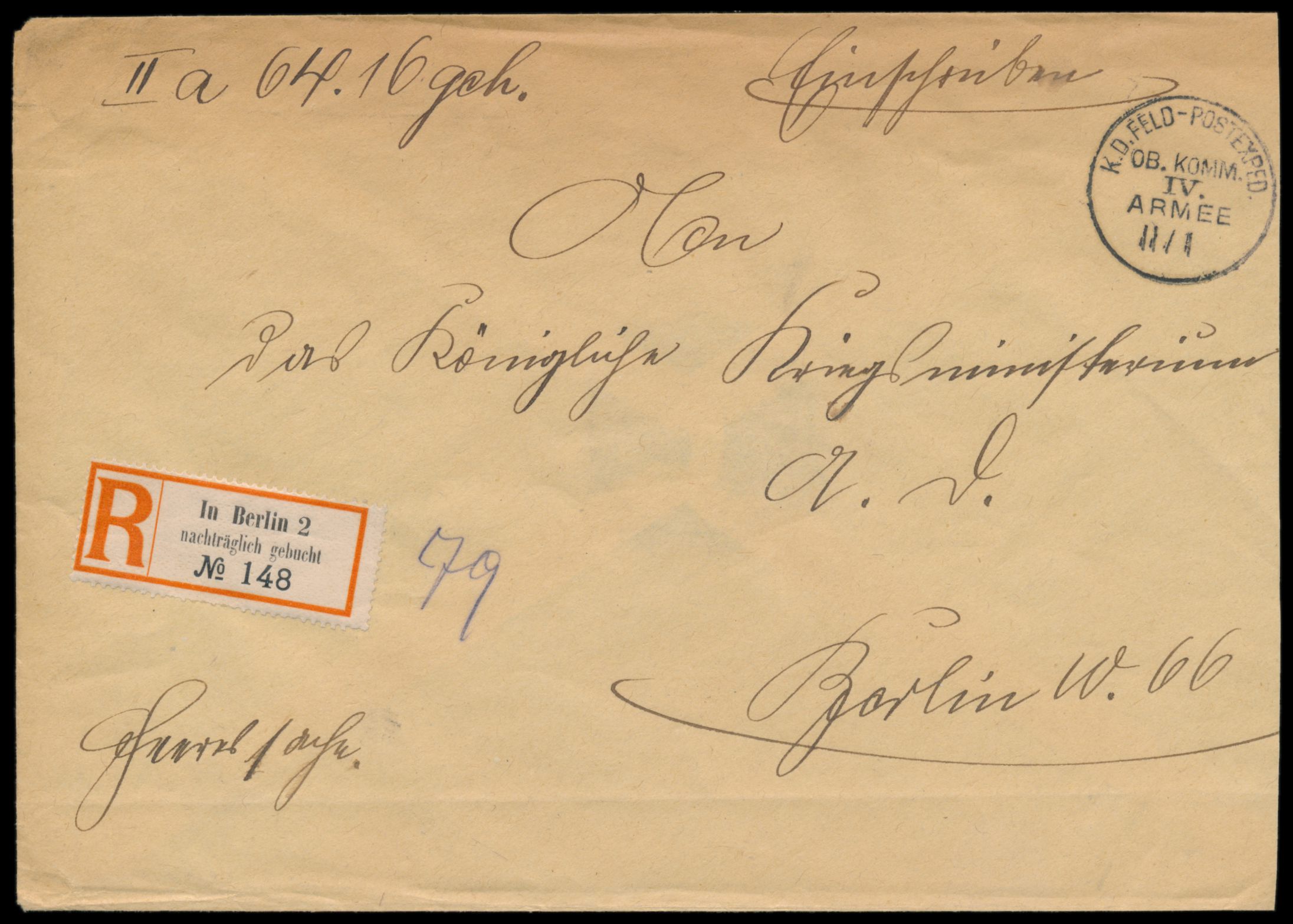 Feldpost-Einschreibbrief mit Stempel K. D. Feld-Postexped. Ob. Komm. IV. Armee 11.1.(1916) an das Kriegsministerium in Berlin, ohne Einschreibzettel bei Aufgabe, deshalb R-Zettel "In Berlin 2 nachträglich gebucht" , Ankunftstempel Berlin W 66, Umschlag ist am oberen Rand minimal gebräunt