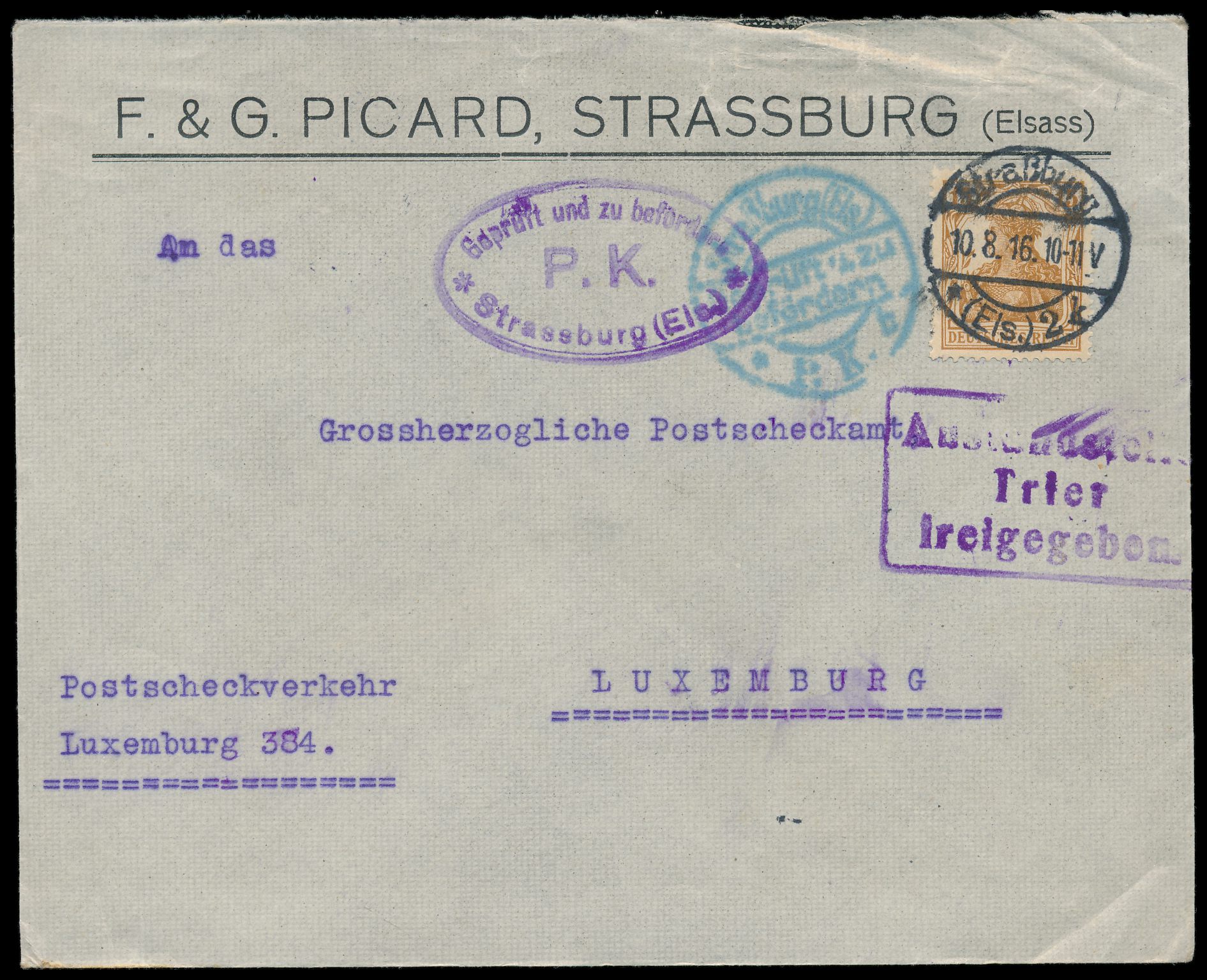 15 Pf. auf Firmenbrief mit Stempel Straßburg (Els.) 2 10.8.16 an das Grossherzogliche Postscheckamt Luxemburg, Vermerk "Postscheckverkehr Luxemburg 384", portopflichtig, zum Inlandstarif frankiert, zwei verschiedene Zensurstempel von Straßburg und Zensurstempel Trier, Ankunftstempel Luxembourg Ville 11.8.16
