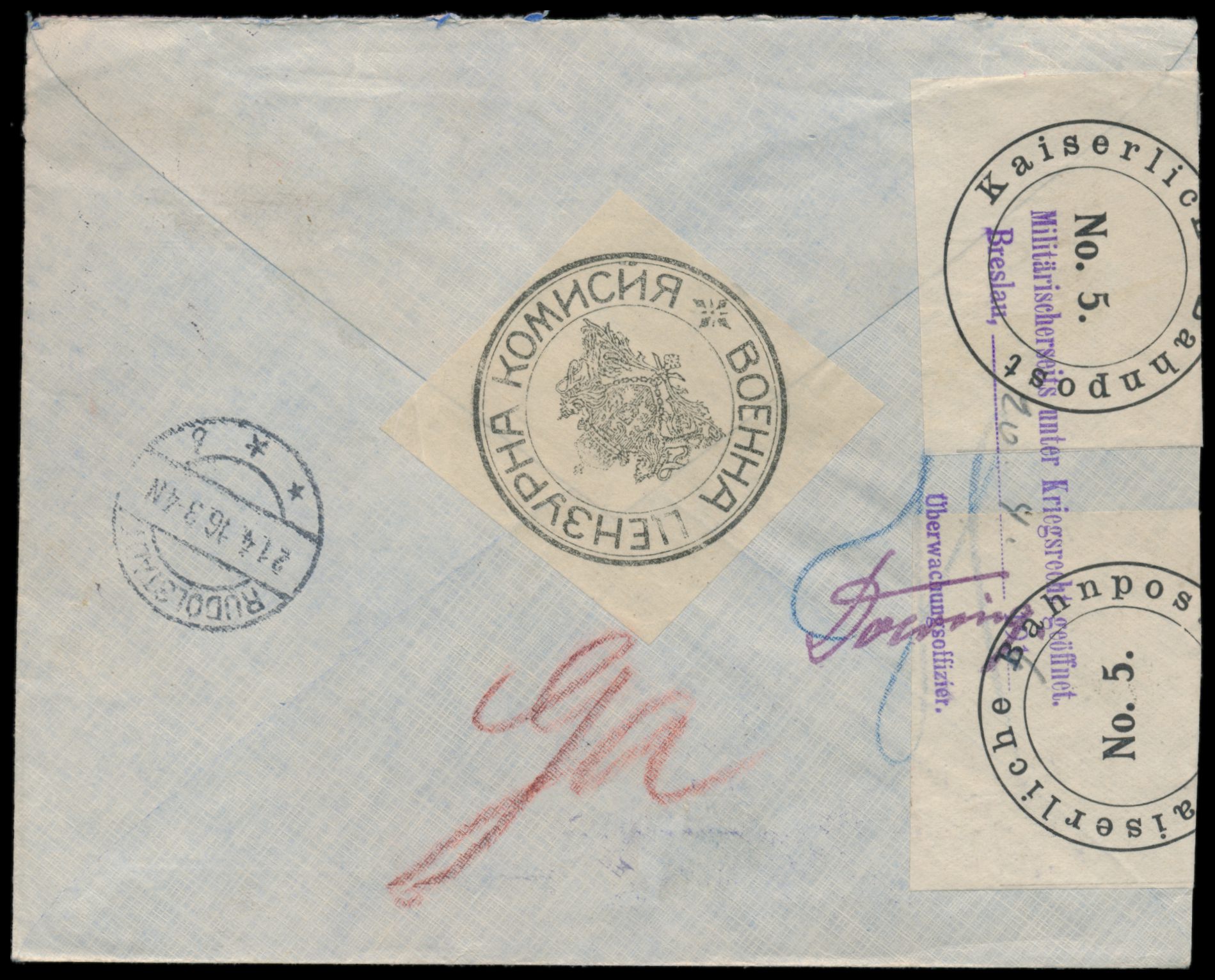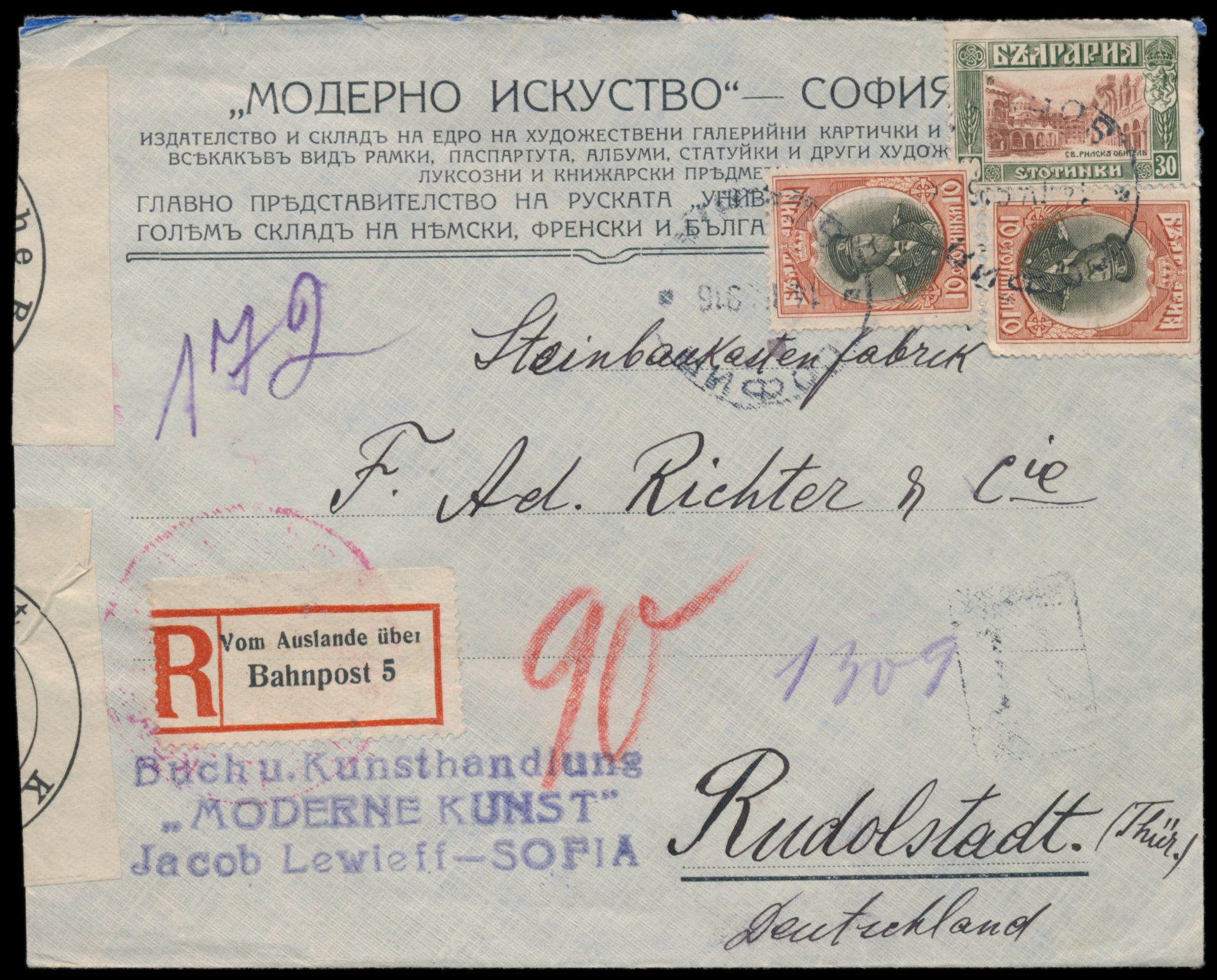 Bulgarien 2 x 10 St. und 30 St. auf Einschreibbrief mit Stempel Sofia 14.9.1916 und schwachem R-Stempel nach Deutschland, bulgarische Zensur und deutsche Zensur Breslau mit Verschlusszettel "Kaiserliche Bahnpost No. 5" und L3 "Militärischerseits unter Kriegsrecht geöffnet. Breslau ... Überwachungsoffizier.", R-Zettel "Vom Auslande über Bahnpost 5" , Ankunftstempel Rudolstadt 21.4.16