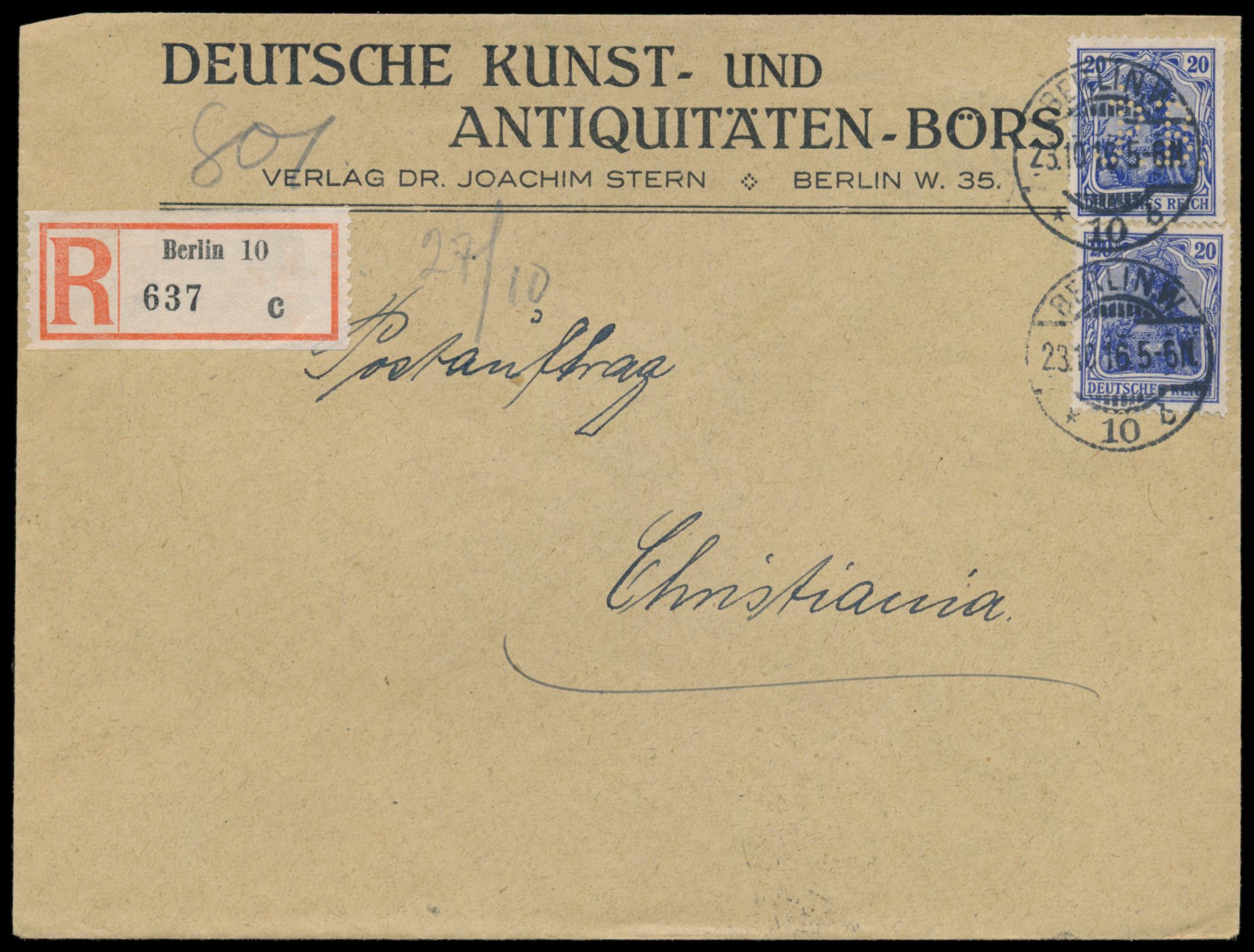 2 x 20 Pf. (1 x Firmenlochung) auf Postauftrag nach Norwegen, Stempel Berlin, W. 10 23.10.16, Ankunftstempel Kristiania 26.10.16, Bedarf