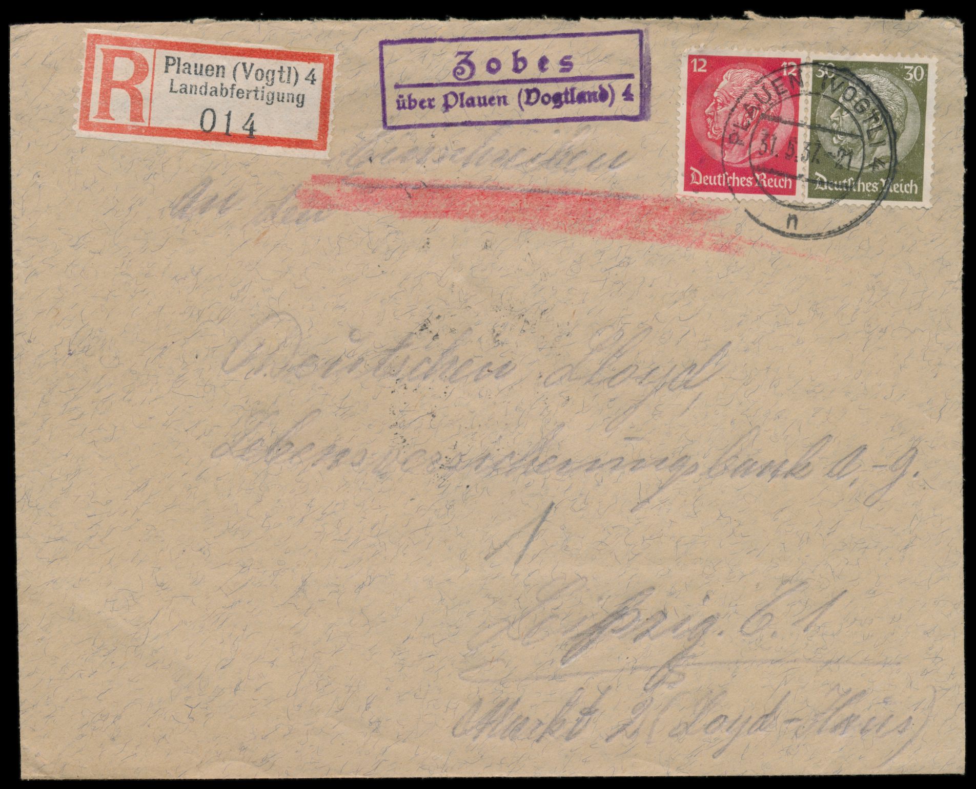 Einschreibbrief mit PSt II-Stempel Zobes über Plauen (Vogtland) 4 und Stempel Plauen (Vogtl) 4 31.5.37, R-Zettel mit Zusatz "Landabfertigung" , nach Leipzig, Ankunftstempel 1.6.37, Bedarf