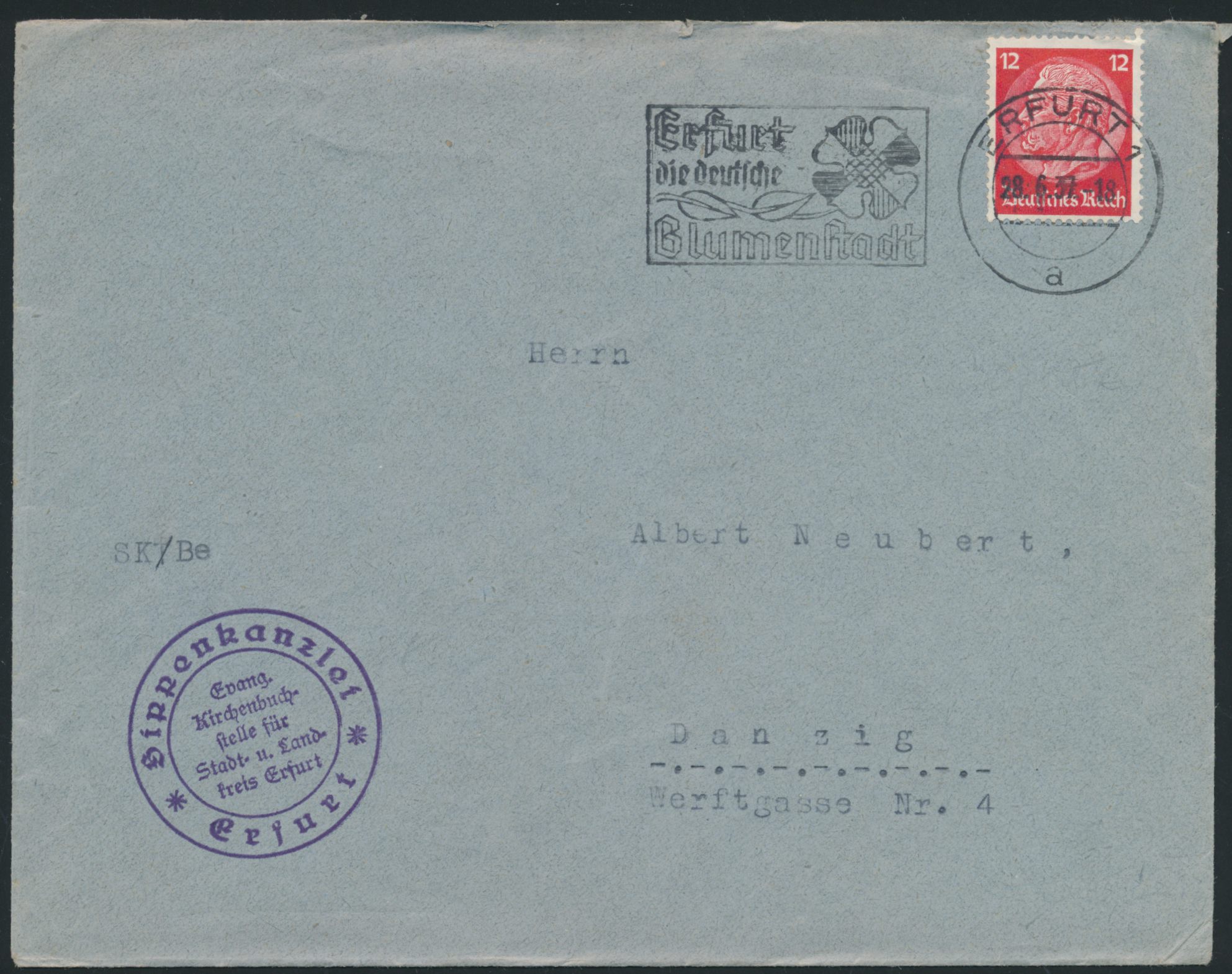 12 Pfg. Hindenburg auf Brief nach Danzig, Maschinenstempel Erfurt 28.6.37, Absenderstempel Sippenkanzlei Erfurt evang. Kirchenbuchstelle