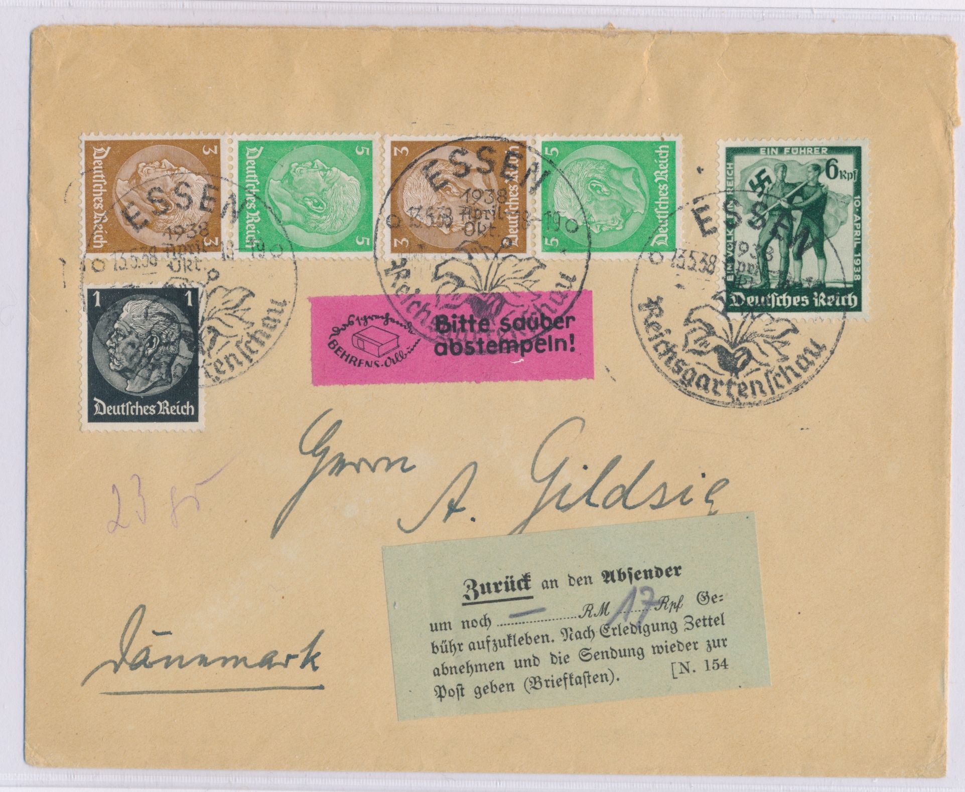 Auslandsbrief 2. Gewicht mit Sonderstempel Essen Reichsgartenschau 13.5.38 nach Dänemark, um 17 Pf. unterfrankiert, grüner Aufkleber "Zurück an Absender um noch ... Gebühr aufzukleben ..."