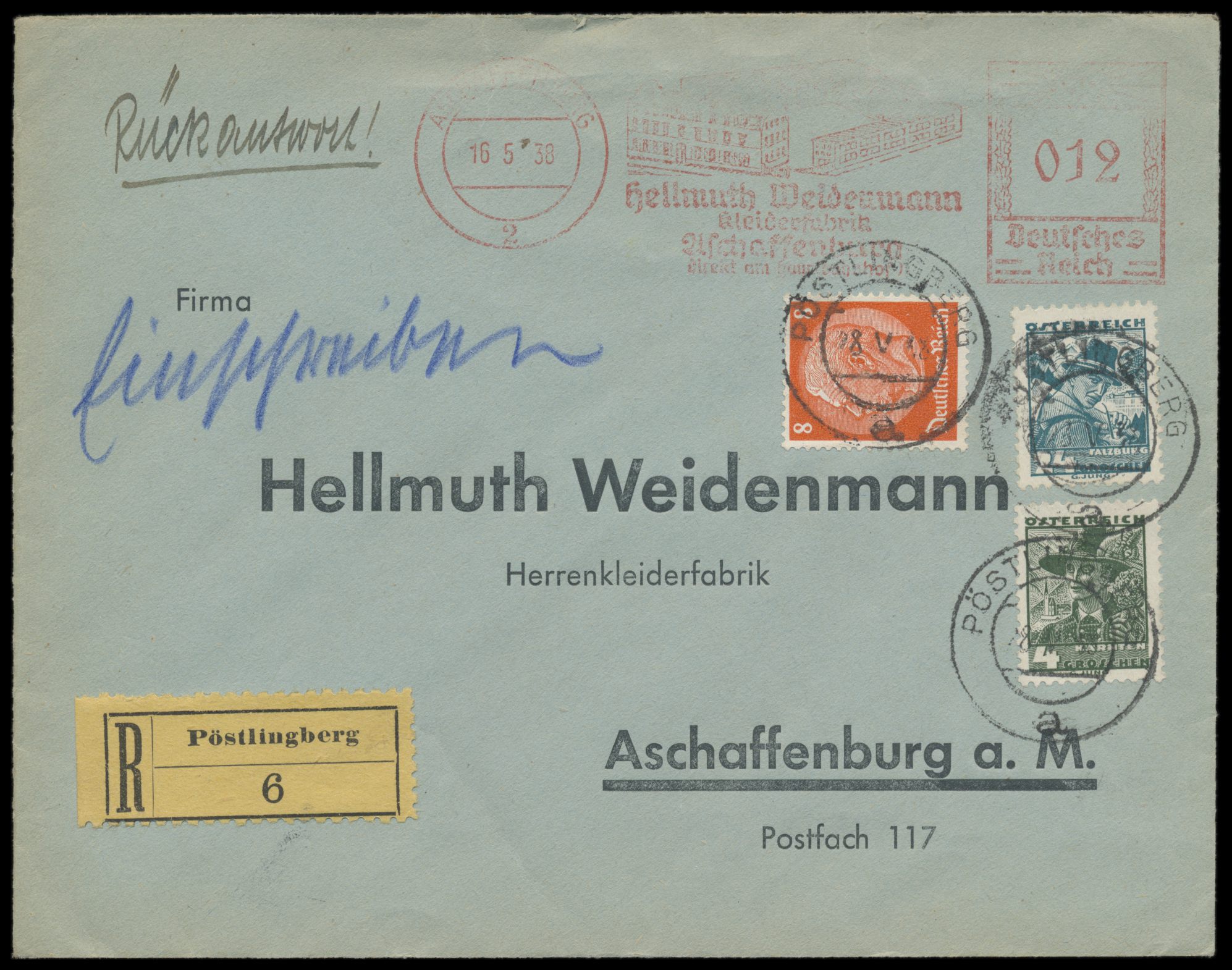 Ostmark: Österreich-Volkstrachten 4 g und 24 g mit 8 Pf. Hindenburg (= 12 g) als österreichische Rekogebühr 40 g auf mit Absenderfreistempel 12 Pf. "... Weidenmann Kleiderfabriken ..." Aschaffenburg 2 16.5.38 vorausfrankiertem Rückumschlag als R-Brief nach Aschaffenburg, Stempel Pöstlingberg 28.5.38, Ankunftstempel 29.5.38, portorichtig, Bedarf