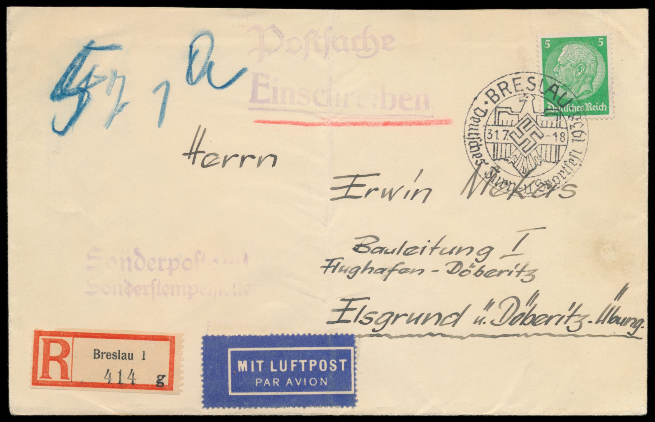Einzelfrankatur 5 Pf. Hindenburg auf Luftpost-Einschreiben-Brief als portofreie Postsache, Sonderstempel Breslau Deutsches Turn- u. Sportfest 1938 31.7.38, Absenderstempel Sonderpostamt / Sonderstempelstelle, nach Elsgrund, Ankunftstempel Döberitz Übungsplatz 7.8.38, senkrechter Mittelbug