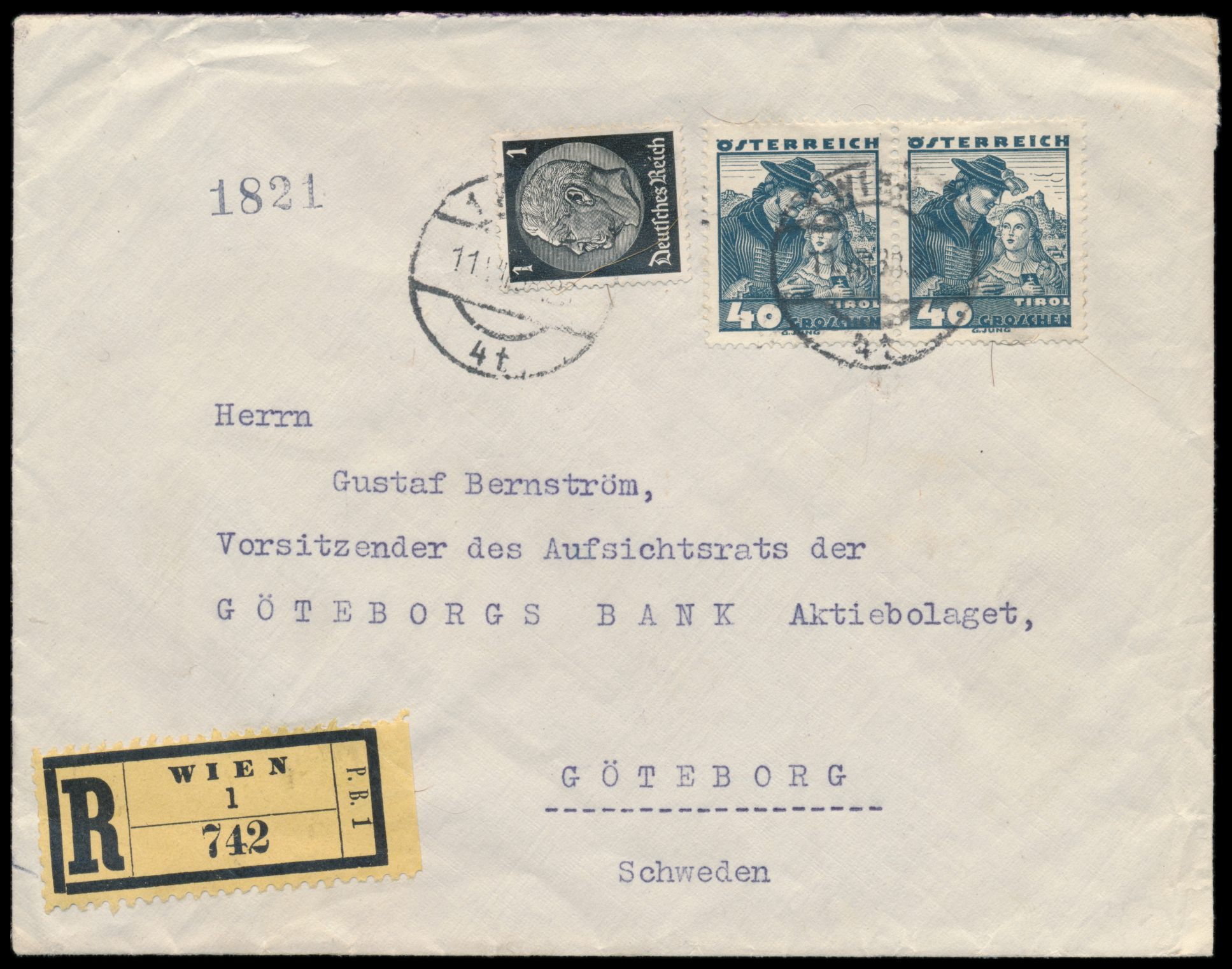 Ostmark, 2 x Österreich-Volkstrachten 40 g. (als 27 Pf.) und 1 Pf. Hindenburg auf Auslands-R-Brief mit Stempel Wien 11.8.38 nach Schweden, ungewöhnliche Frankatur-Kombination, portorichtig, Bedarf