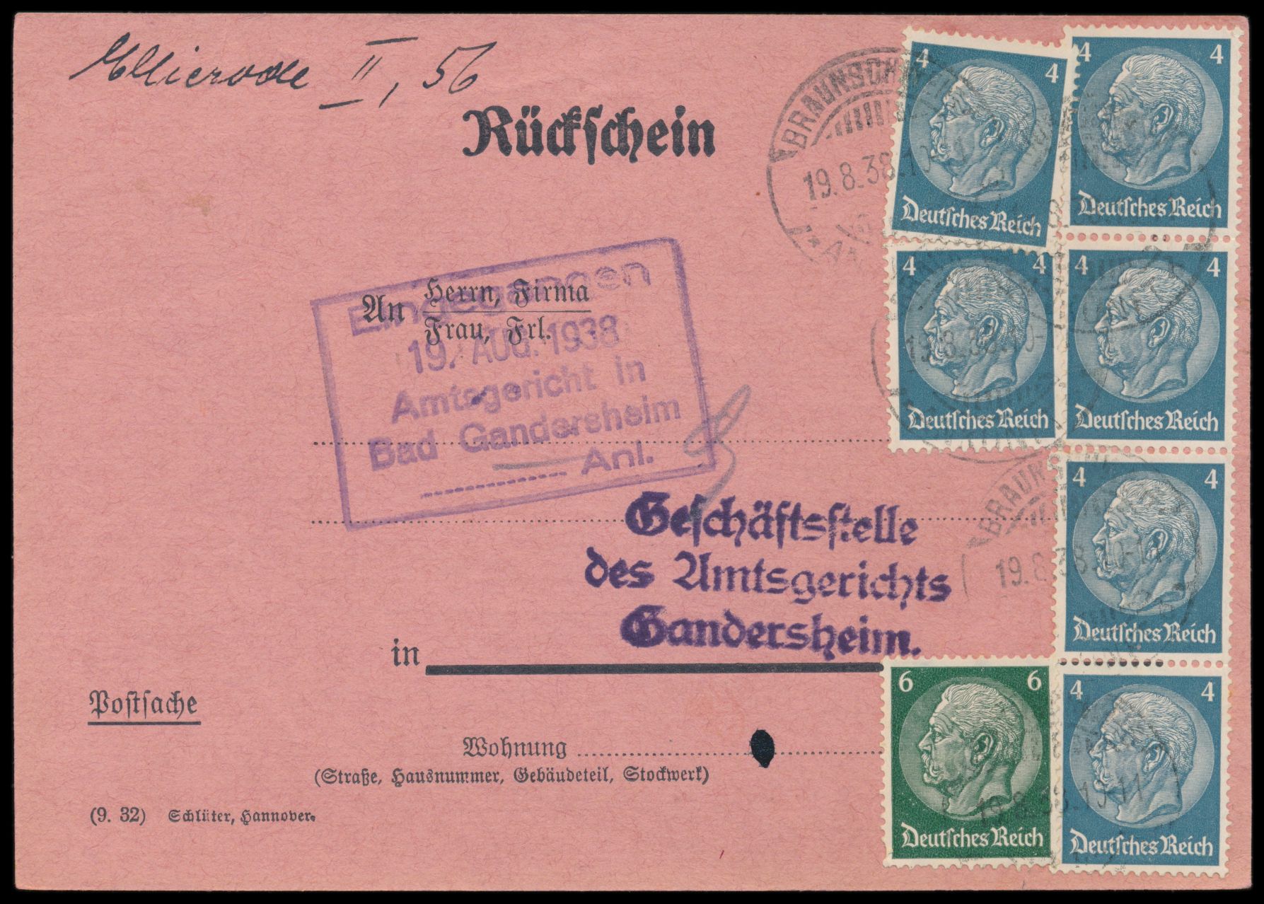 Rückschein mit verklebter Rückscheingebühr 30 Pf.: 6 x 4 Pf. und 6 Pf. Hindenburg, Stempel Braunschweig Ankunft 19.8.38, an das Amtsgericht Gandersheim, Behörden-Eingangsstempel 19.8.1938, Bedarf