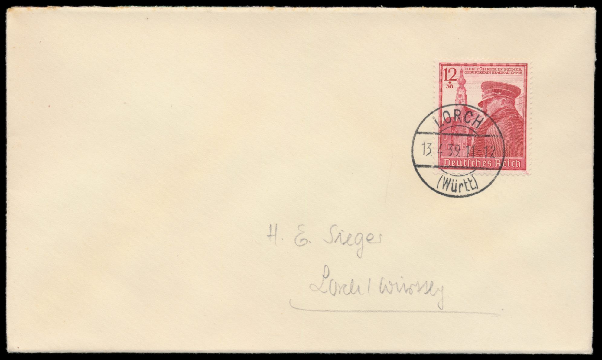 Sondermarke 50. Geburtstag von Adolf Hitler 12 + 38 Pf. auf Ortsbrief mit Stempel Lorch 13.4.39, seltener FDC, MiPr. 500