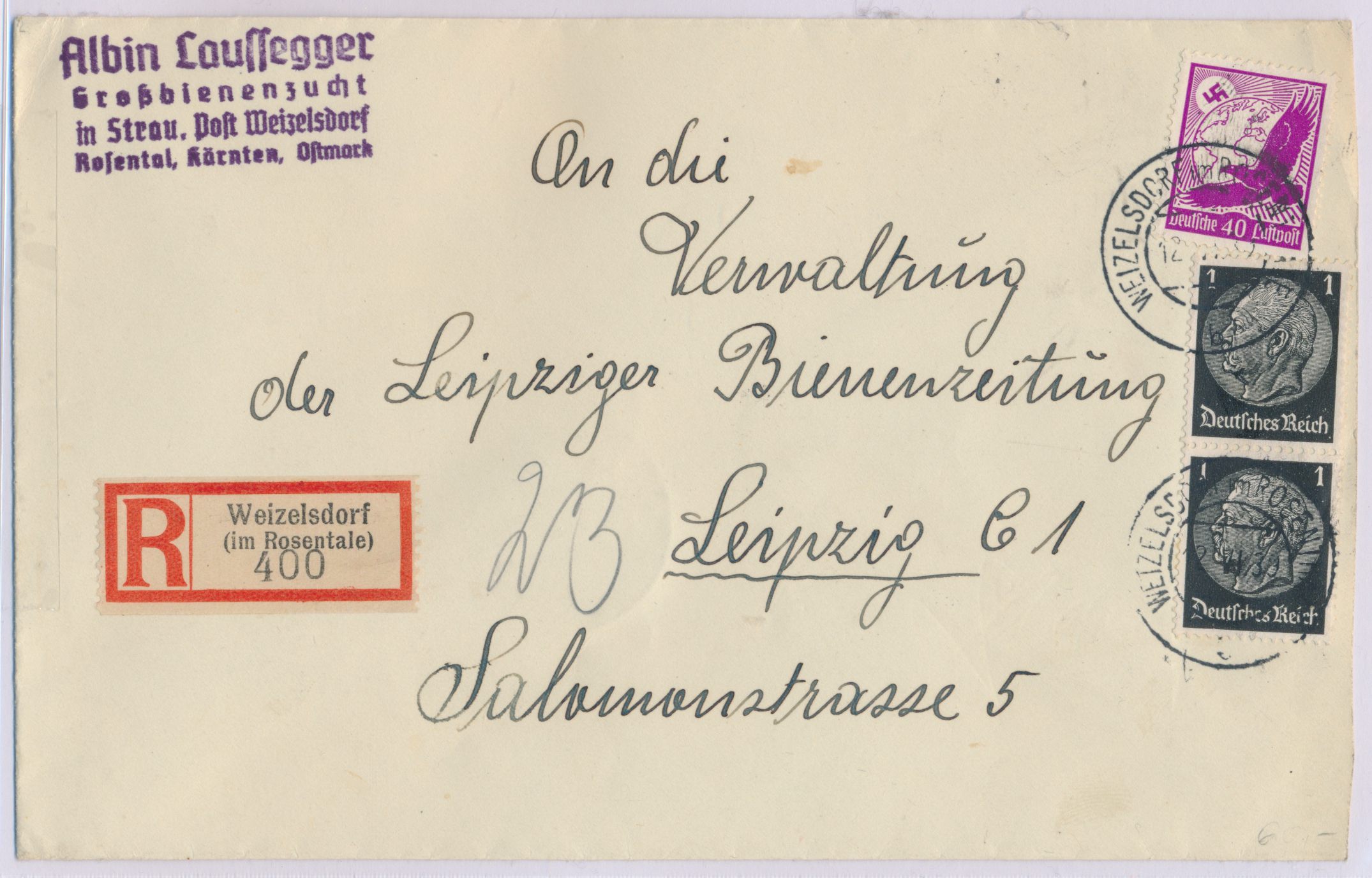 2 x 1 Pfg. Hindenburg und 40 Pfg. Flugpost auf Einschreibbrief nach Leipzig, Absender aus Strau in Kärnten, Stempel und R-Zettel Weikelsdorf (im Rosentale) 12.6.39, Ankunftstempel 13.6.39