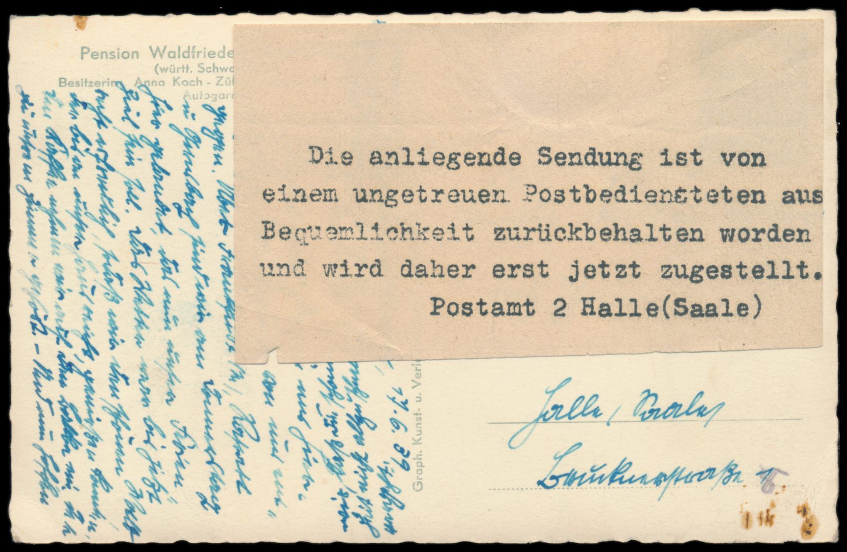 6 Pf. Hindenburg auf Ansichtskarte mit Stempel Baiersbronn 17.6.39 nach Halle, Aufkleber wegen Verzögerung mit hektografiertem Text: "Die anliegende Sendung ist von einem ungetreuen Postbediensteten aus Bequemlichkeit zurückbehalten worden und wird daher erst jetzt zugestellt. Postamt 2 Halle (Saale)"