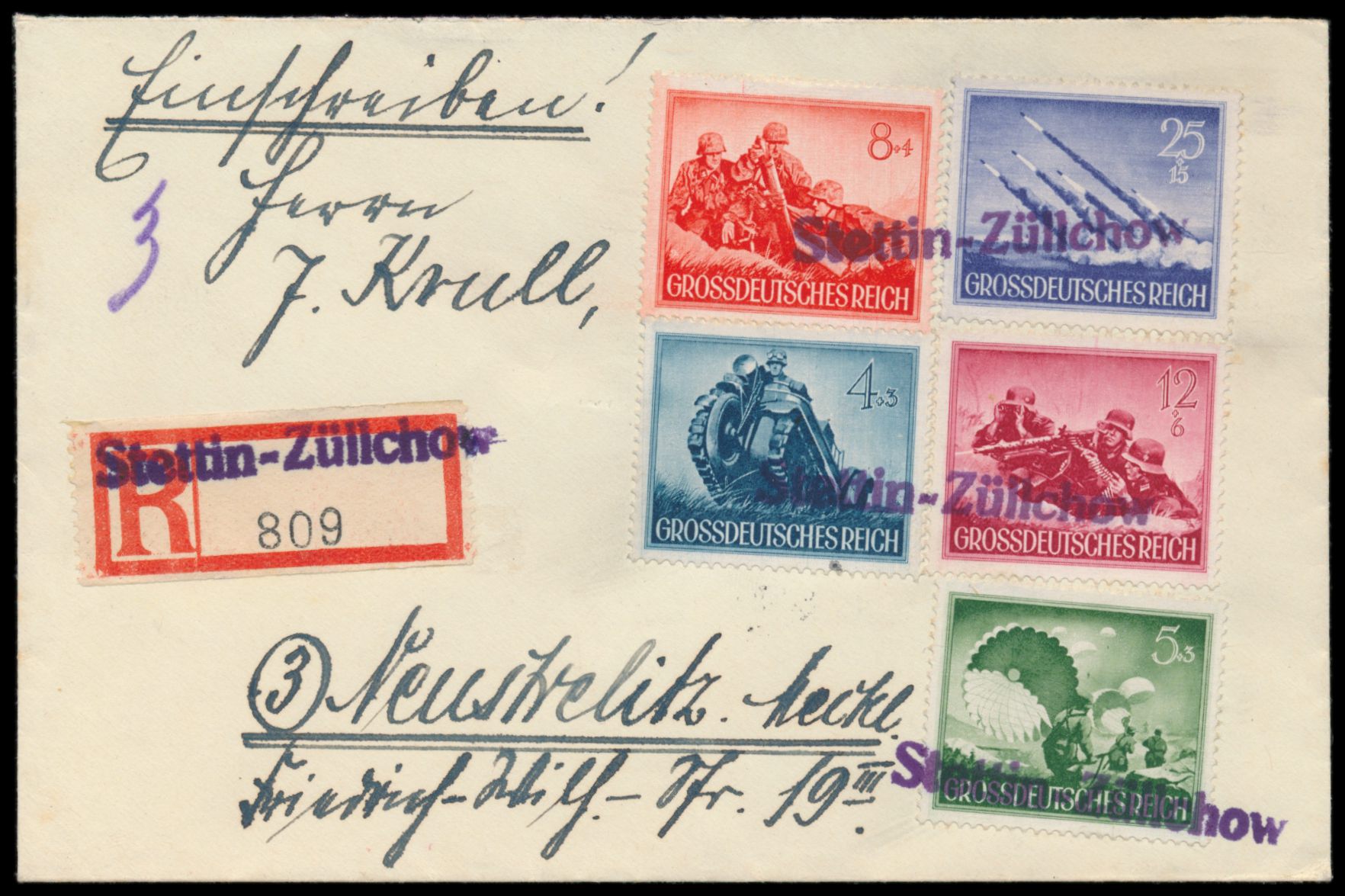 Einschreibbrief mit Sondermarken-Mischfrankatur 54 Pf., entwertet mit violettem Not-L1 Stettin-Züllchow, gleicher Stempel auch auf Blanko-R-Zettel, nach Neustrelitz, Ankunftstempel 1.10.44