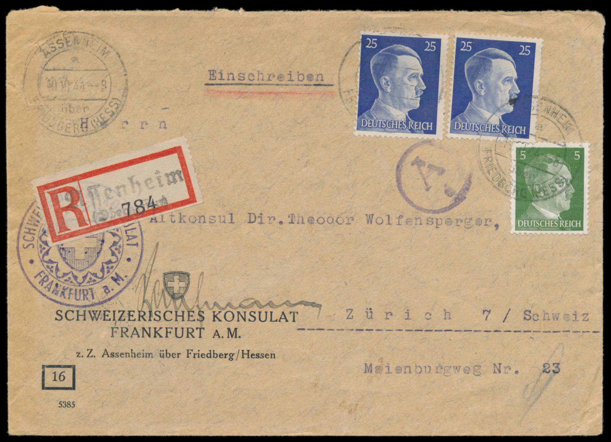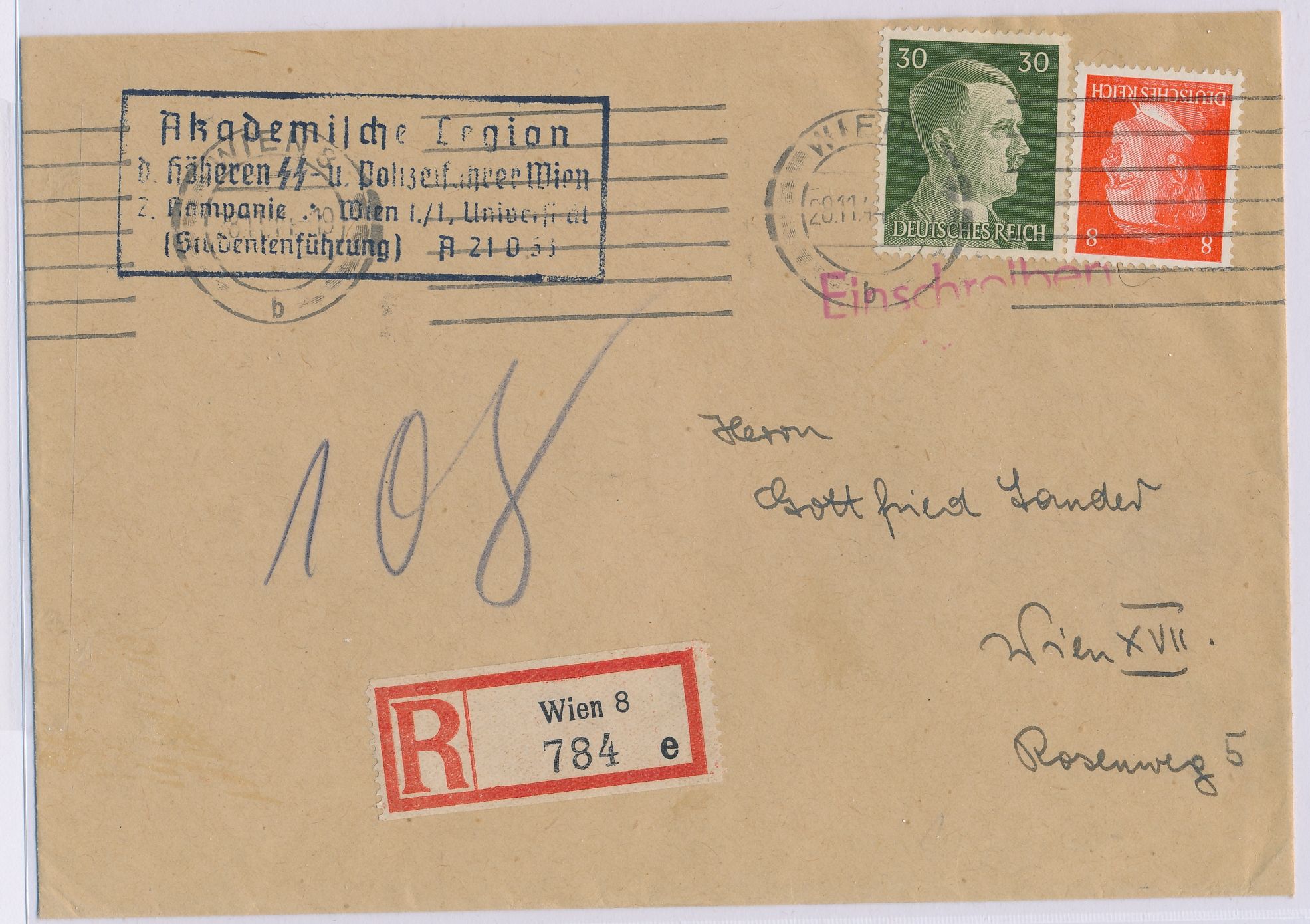 Orts-Einschreibbrief mit Maschinenstempel Wien 8 28.11.44, Frankatur 8 und 30 Pf. Hitler, vorderseitig Absenderstempel "Akademische Legion d. höheren SS- u. Polizeiführer Wien ..." , Ankunftstempel 29.11.44