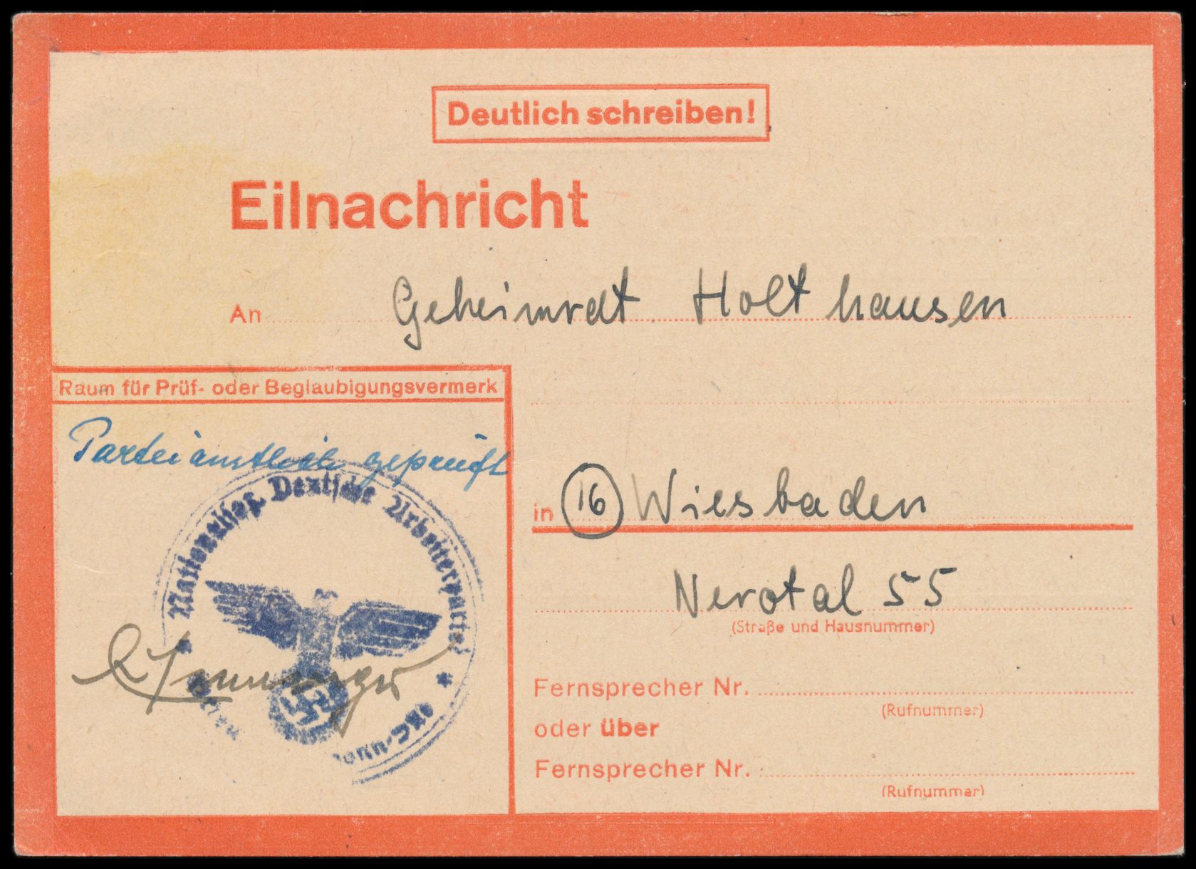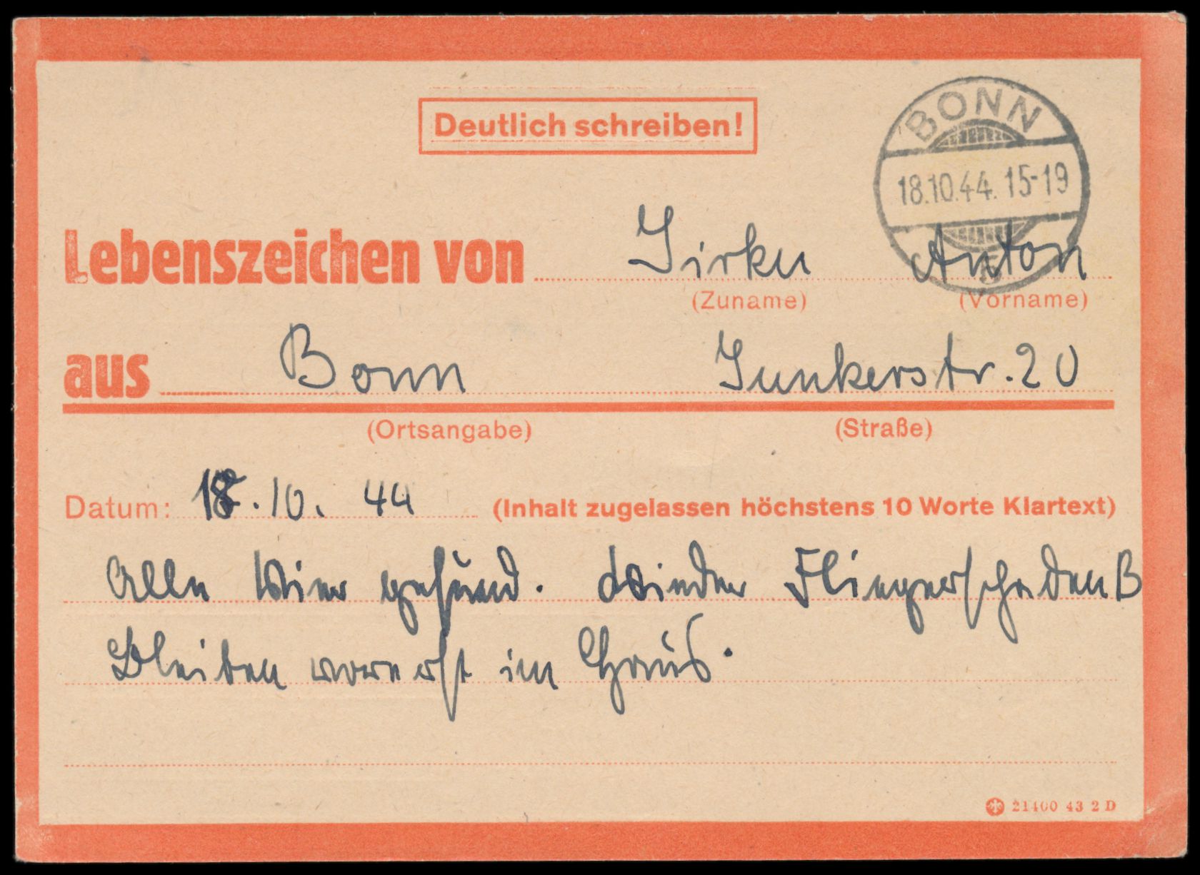 Eilnachrichtenkarte "Lebenszeichen von ..." mit aus Bonn nach Wiesbaden, NSDAP-Dienstsiegel und handschriftlich "Parteiamtlich geprüft", rückseitig Stempel Bonn 5 18.10.44, seltenes Dokument für den verheerenden Bombenangriff auf Bonn am 18.10.1944, bei dem fast die gesamte Innenstadt zerstört wurde