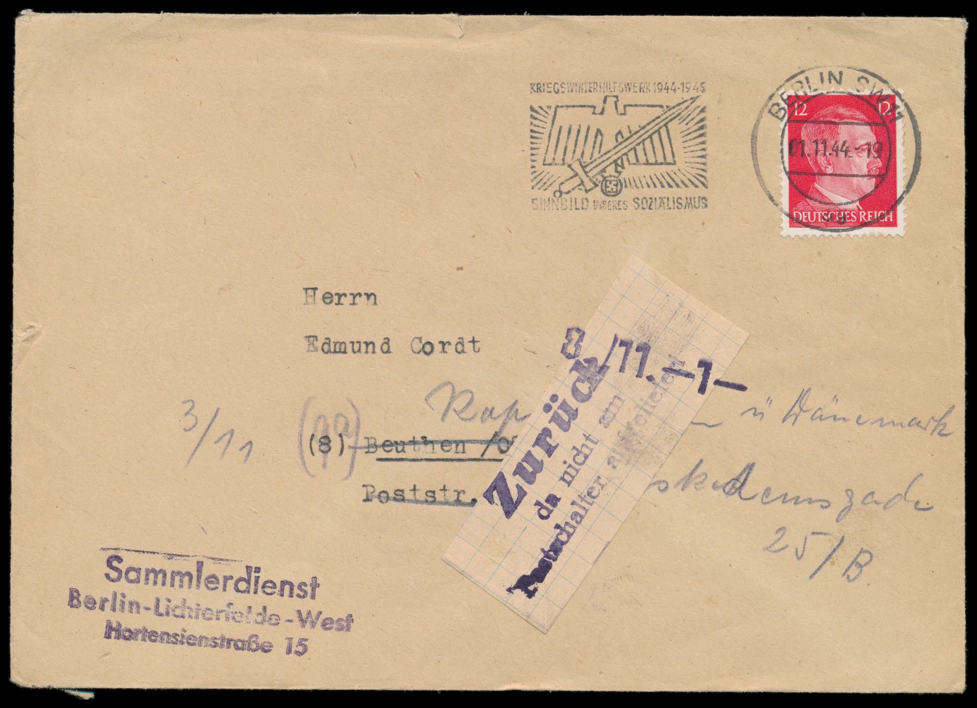 12 Pf. Hitler auf Brief mit Maschinenstempel Berlin SW 11 1.11.44 nach Beuthen, dort am 3.11. nach Kopenhagen umadressiert, Nachsendung ins Ausland unzulässig, deshalb Aufkleber "Zurück / da nicht am / Postschalter aufgeliefert" und Datum-Stempel 8.11.