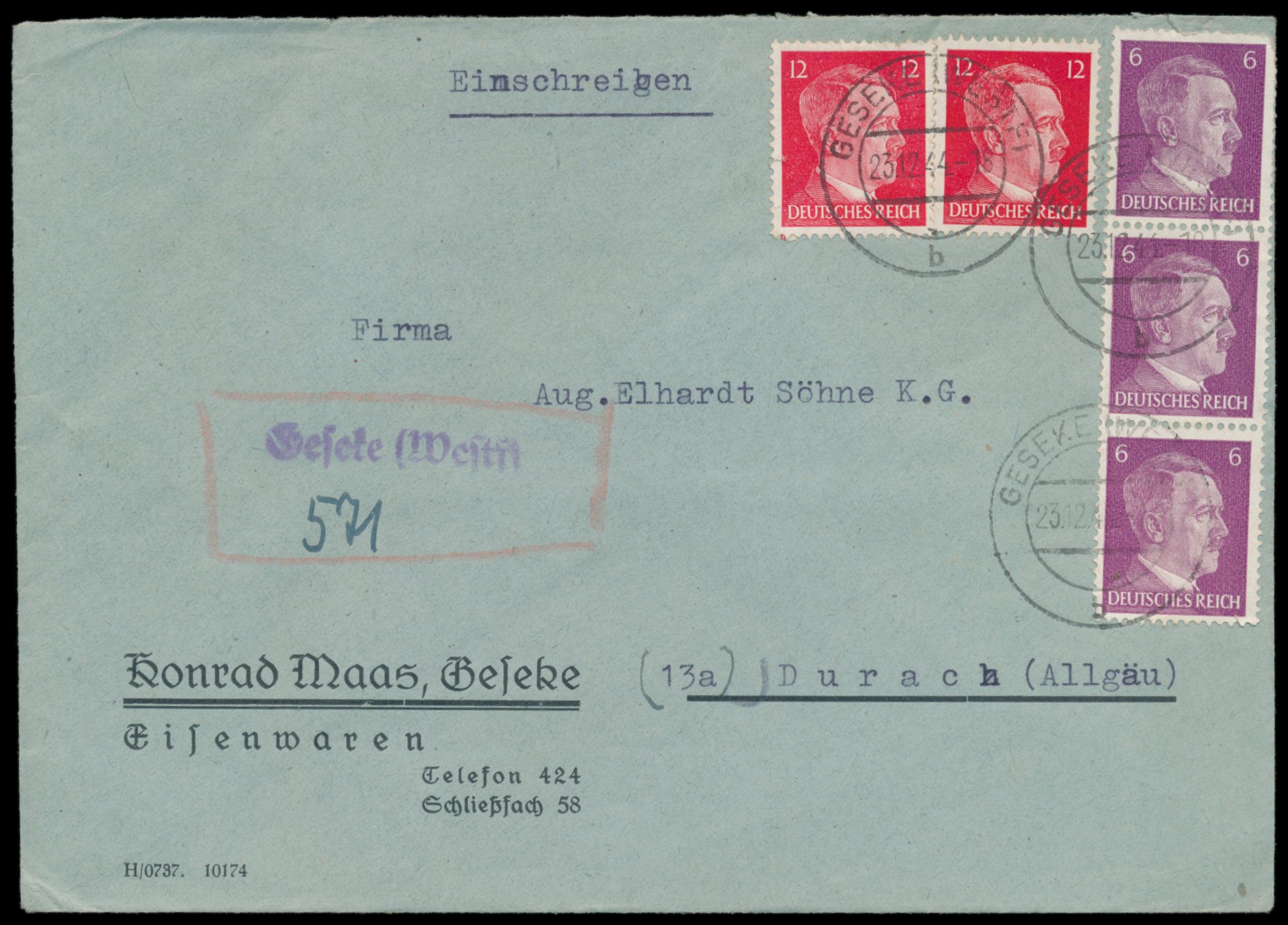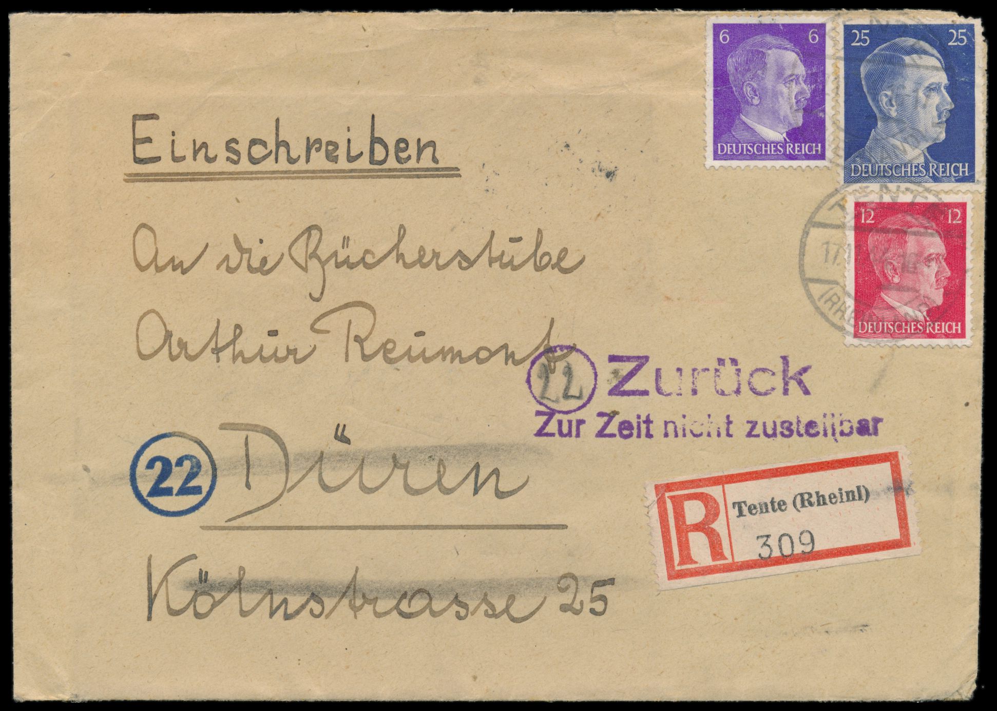 6, 12 und 25 Pf. Hitler (letztere kleine Mängel) auf Einschreibbrief mit Stempel Tente (Rheinland) 17.11.44, Absender aus Wermelskirchen) nach Düren , einen Tag nach dem verheerenden alliierten Luftangriff am 16.11.1944 durch den Düren fast vollständig zerstört wurde und die überlebende Zivilbevölkerung am 19.11.1944 evakuiert werden musste, deshalb violetter L2 Zurück / Zur Zeit nicht zustellbar, Ankunftstempel Wermelskirchen 2.2.45, mit Inhalt