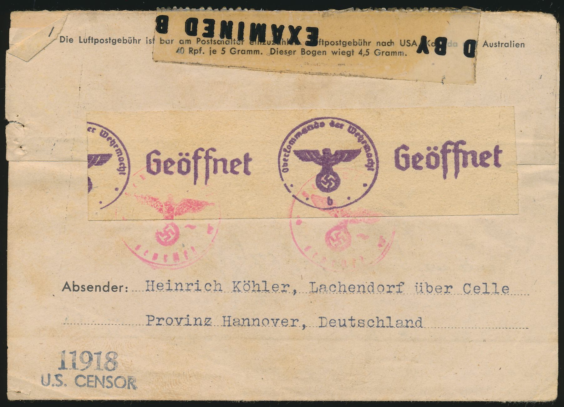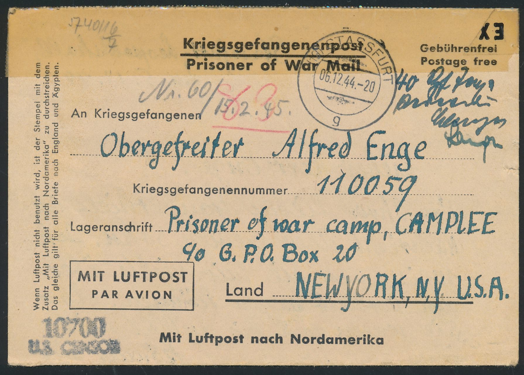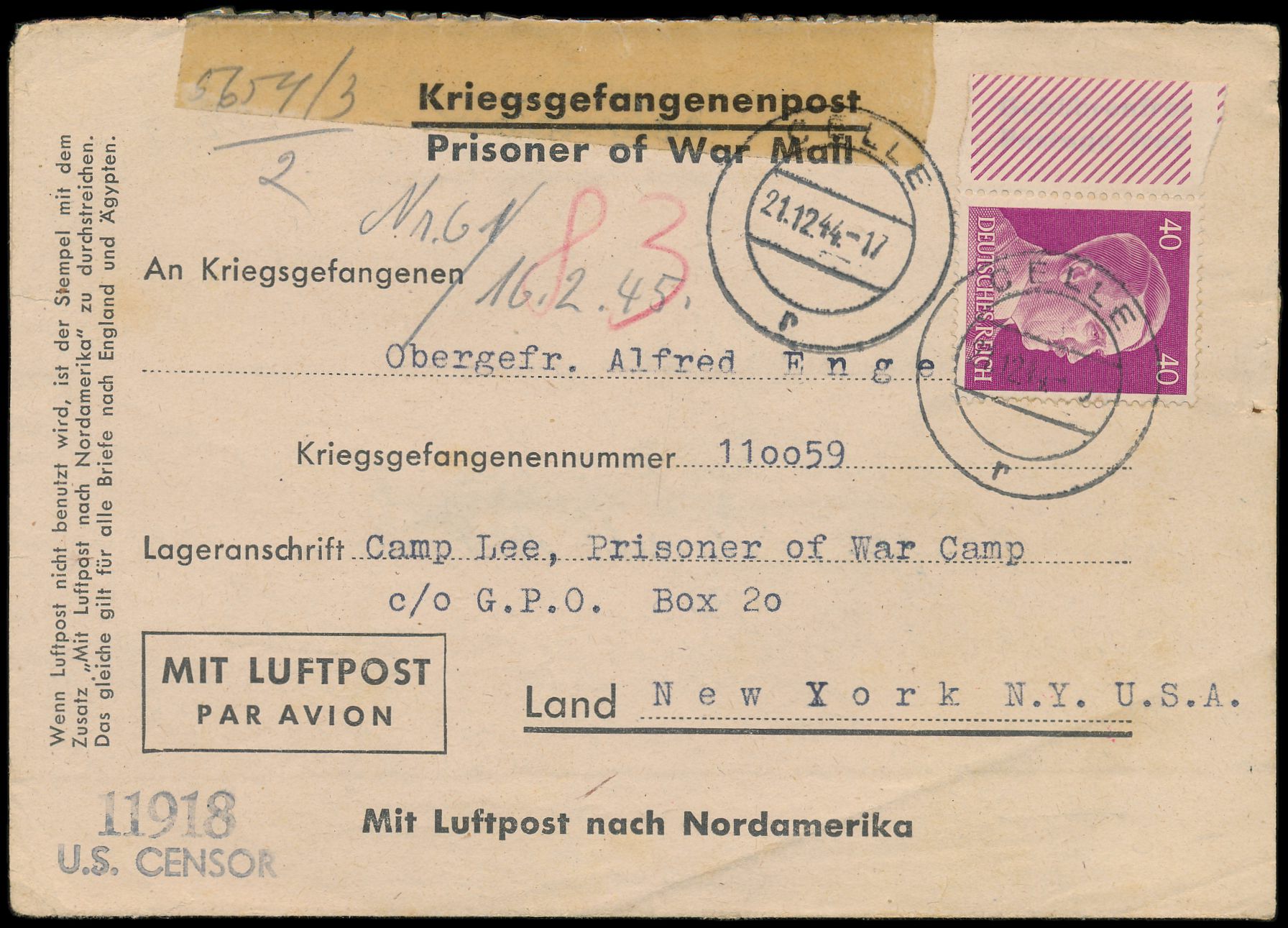 Einzelfrankatur 40 Pf. Hitler (Seitenrand links) als Luftpostzuschlag auf Kriegsgefangenen-Vordruckfaltbrief nach Camp Lee / USA, Stempel Celle 21.12.44, deutsche Zensur Berlin und US-Zensur