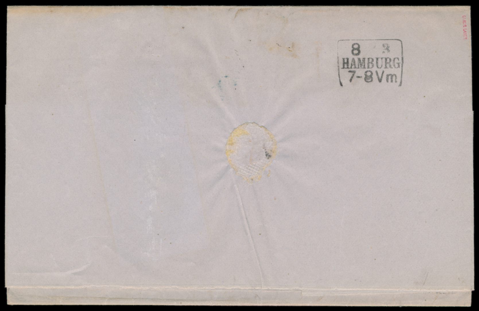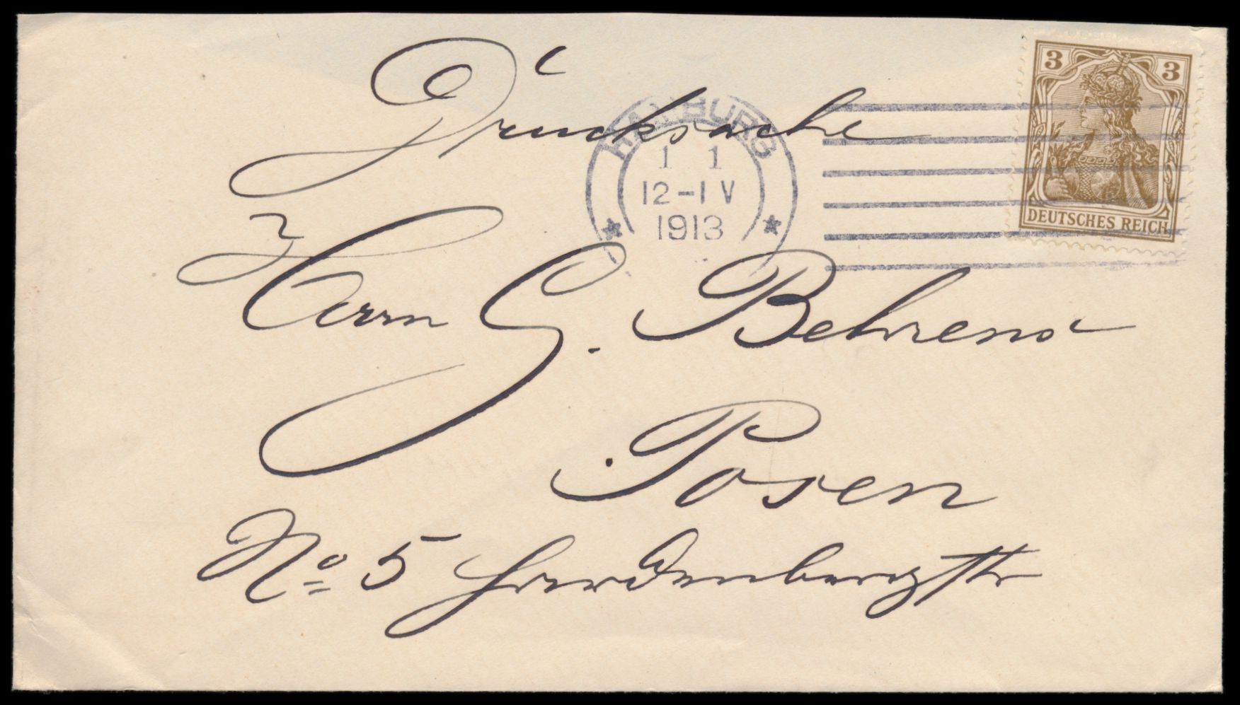 Columbia-Maschinenstempel Hamburg * * 1.1.1913 mit neuem Stempelkopf und neuer Stempelfahne aus sechs kurzen Linien, laut Kohlhaas / Riese nur am 1.1.1913 und 31.12.1913 verwendet (vgl. "Die Columbia-Briefstempelmaschinen ... S. 68), auf Drucksache mit 3 Pf. Germania nach Posen, rückseitig fehlt die Briefklappe