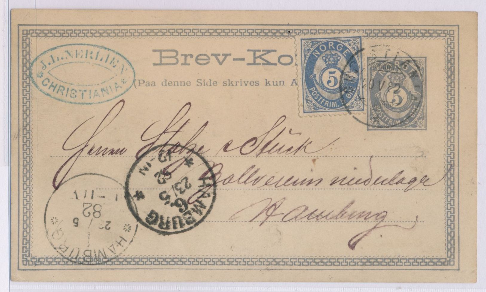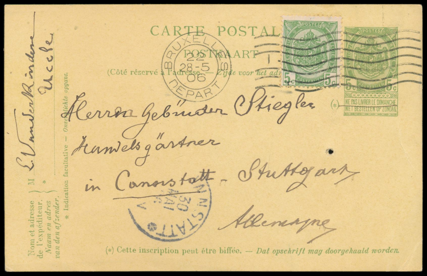 Belgien-Ganzsache 5 C. mit Zusatzfrankatur 5 C. nach Deutschland, seltener Hey Dolphin / "International"-Maschinenstempel Bruxelles Depart 28.5.06 mit Fahne aus Wellenlinien mit Maschinennummer I und Unterscheidungsbuchstaben T, während der Versuchsphase, laut Silverberg nur vom 25.5. bis 29.5.1906 belegt, Ankunftsstempel Cannstatt 30.5.06, kleines Aufspießloch, Bedarf