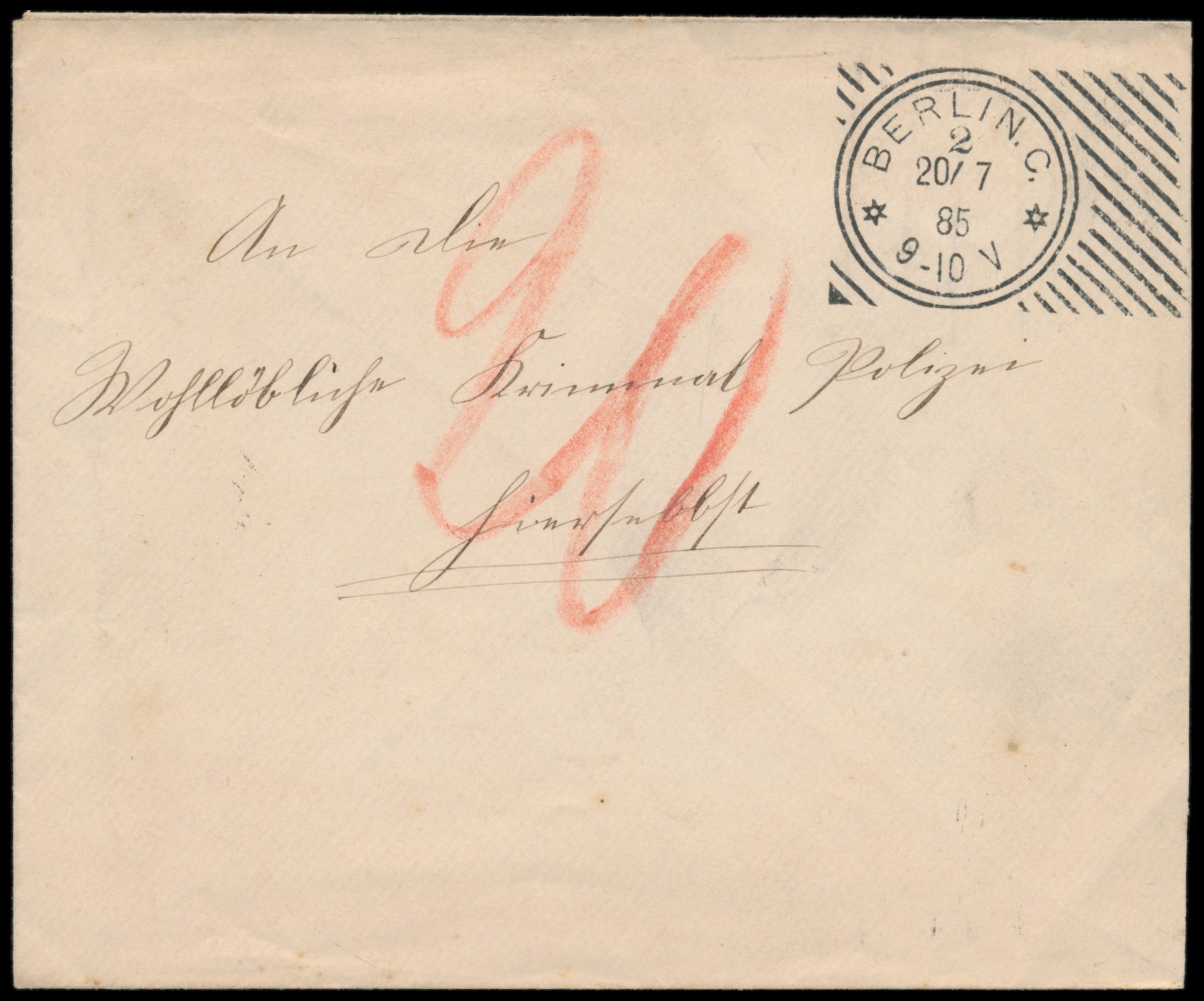 Hoster- Maschinenstempel Berlin C2 20.7.85 aus der Versuchszeit , Miller HO-2, ohne Nummern, "2 unter L", auf unfrankiertem Ortsbrief mit Nachgebühr 20 Pf., Ankunftstempel 20.7., Bedarf