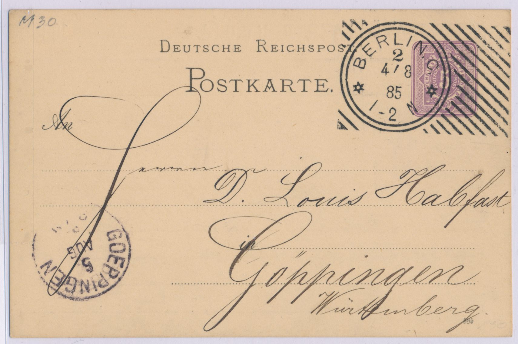 Hoster- Maschinenstempel Berlin C2 4.8.85 ohne Nummern, Miller HO-2, frühes Datum auf Ganzsache 5 Pfg. mit Firmenzudruck Bröchner nach Göppingen, Ankunftstempel 5.8., Bedarf
