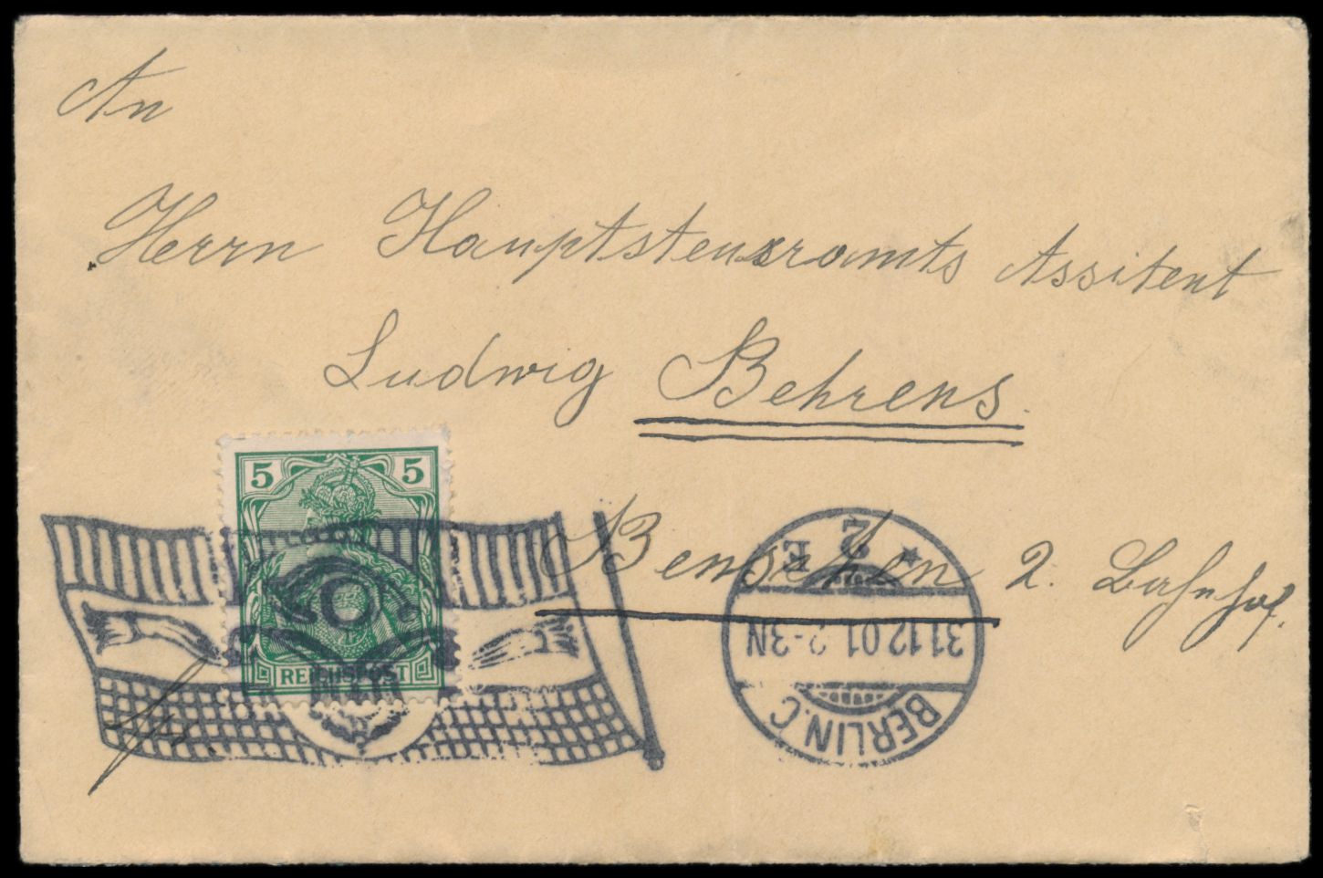 Beling & Lübke-Maschinenstempel Berlin C. 2 E 31.12.01 mit Flagge Krone / Posthorn, links unten kopfstehend auf kleinformatigem Briefumschlag nach Benschen, Frankatur 5 Pf., unauffälliger senkrechter Mittelbug