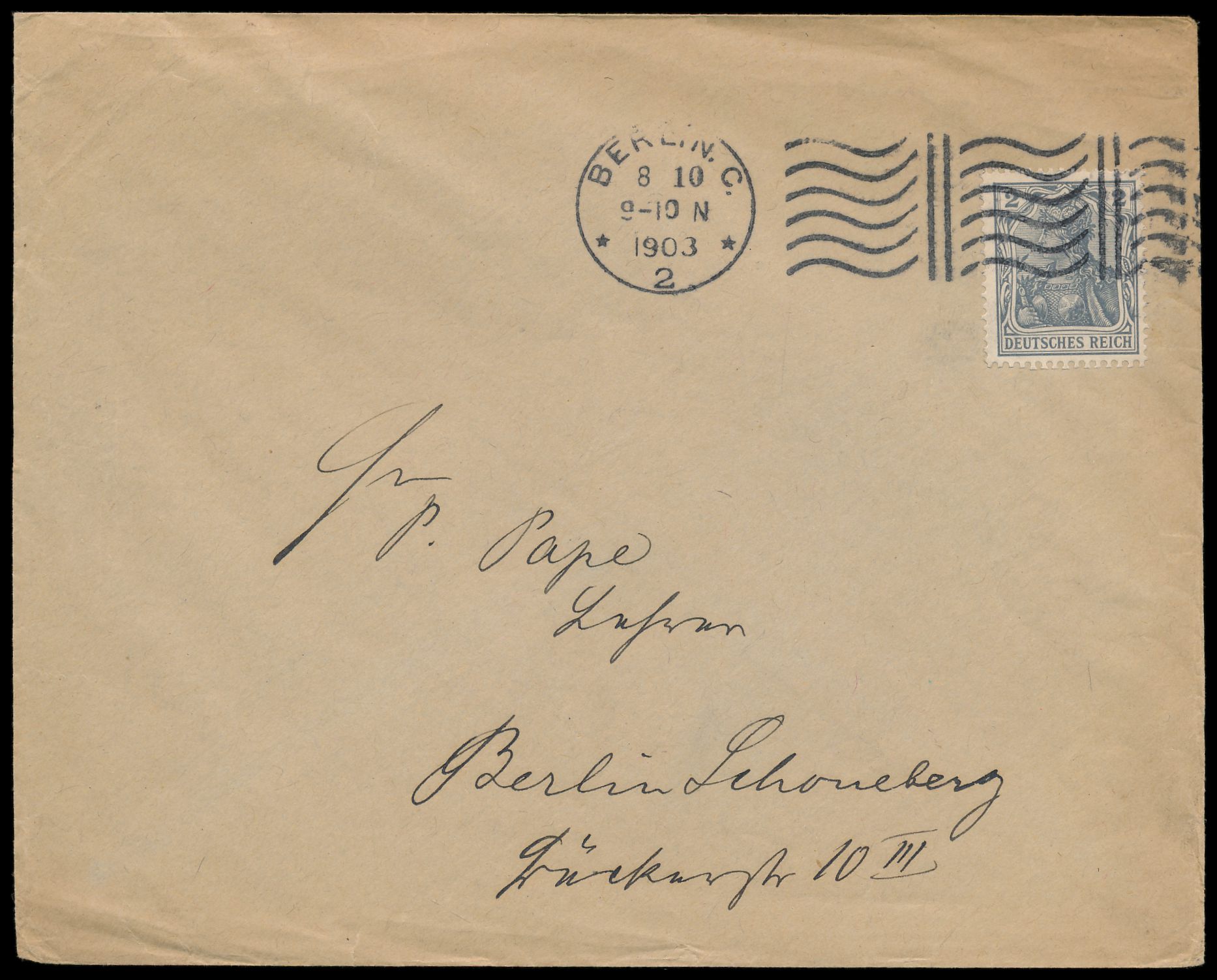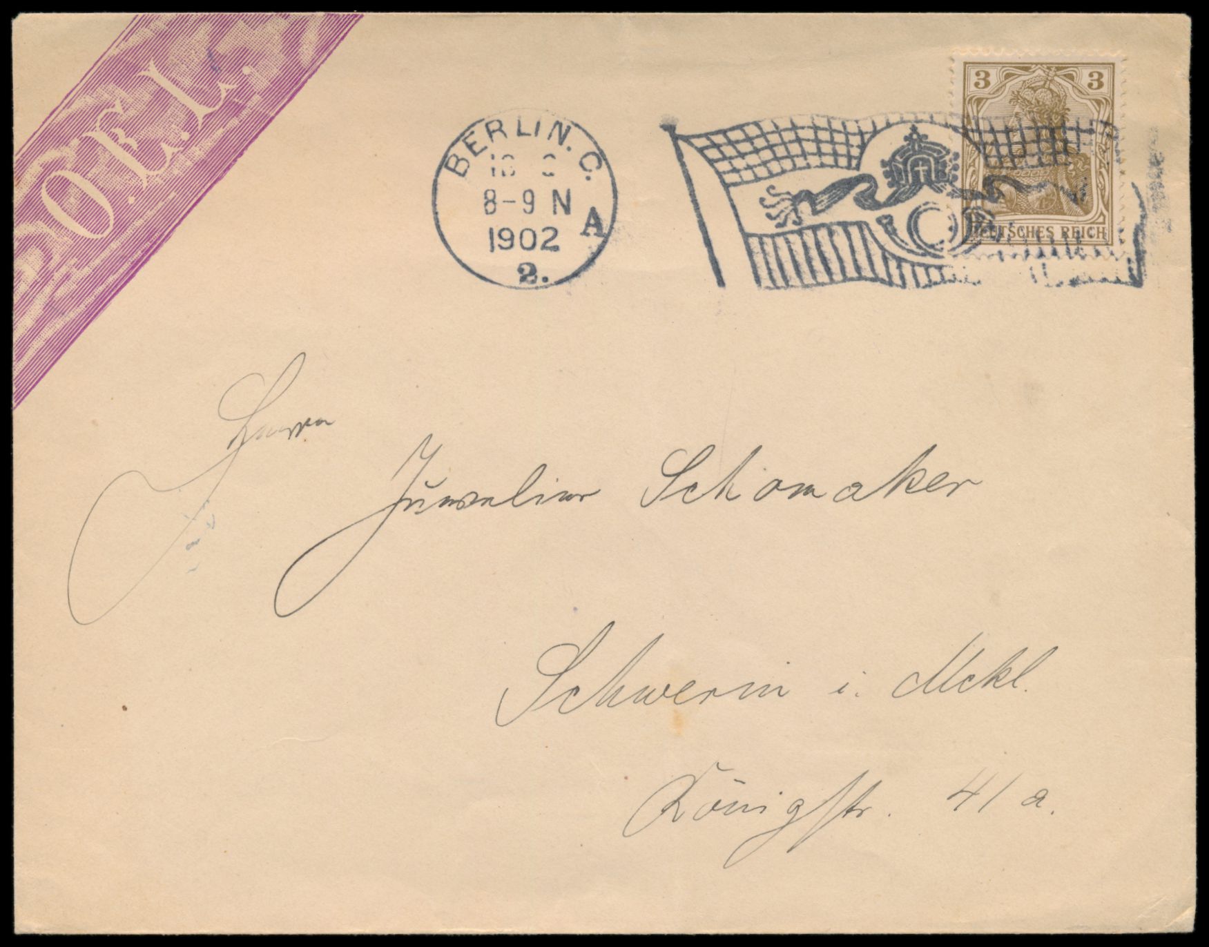 Columbia-Maschinenstempel Berlin. C. 2 A 18.?.02 mit Fahne Krone / Posthorn auf Drucksache mit 3 Pf. Germania nach Schwerin, senkrechter Mittelbug, Bedarf