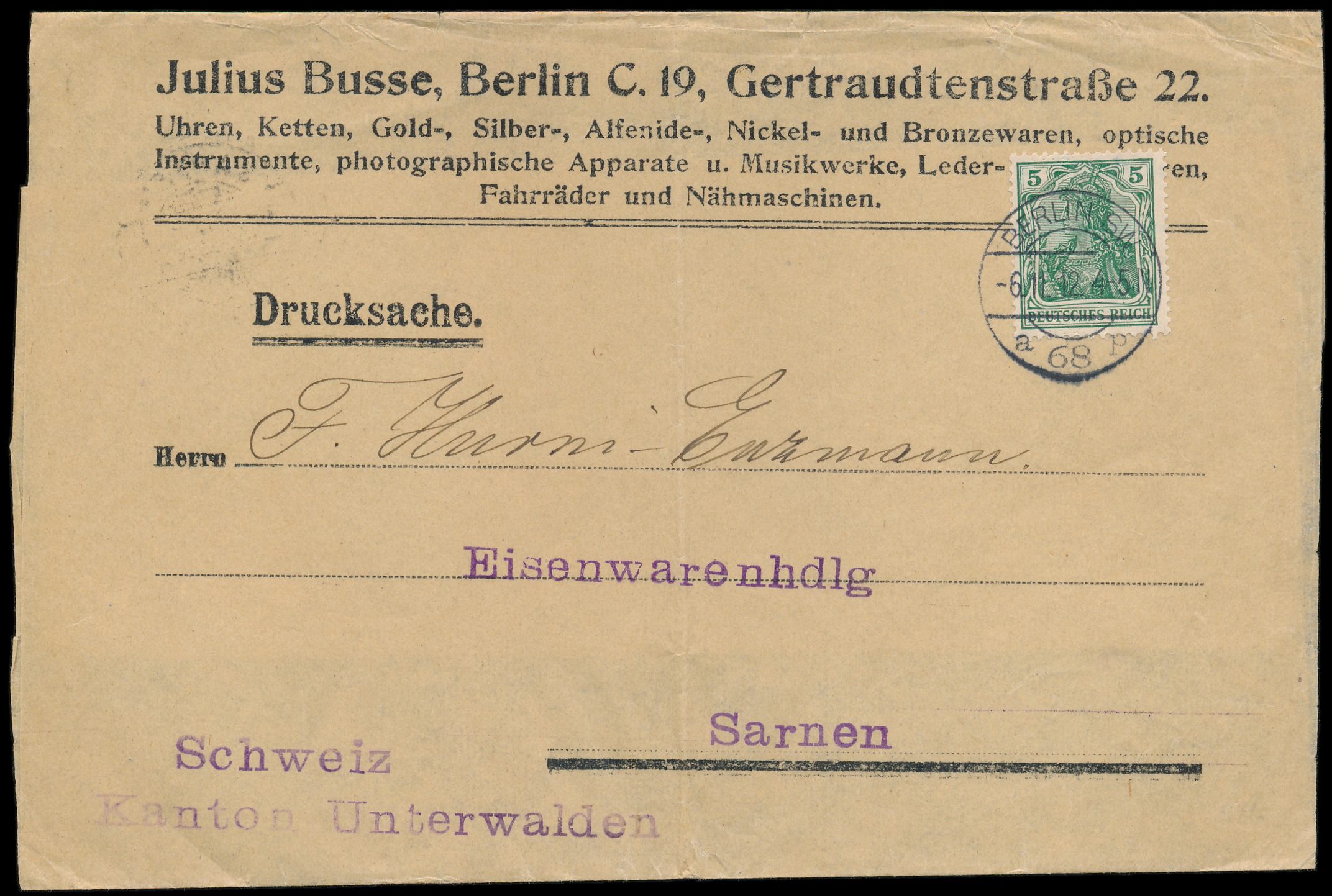 Michelius-Frankiermaschine Berlin SW a 68 p 6.11.12 mit 5 Pf. auf Auslandsdrucksache in die Schweiz, Ankunftstempel Sarnen 11.11.12, senkrechter Mittelbug, Bedarf