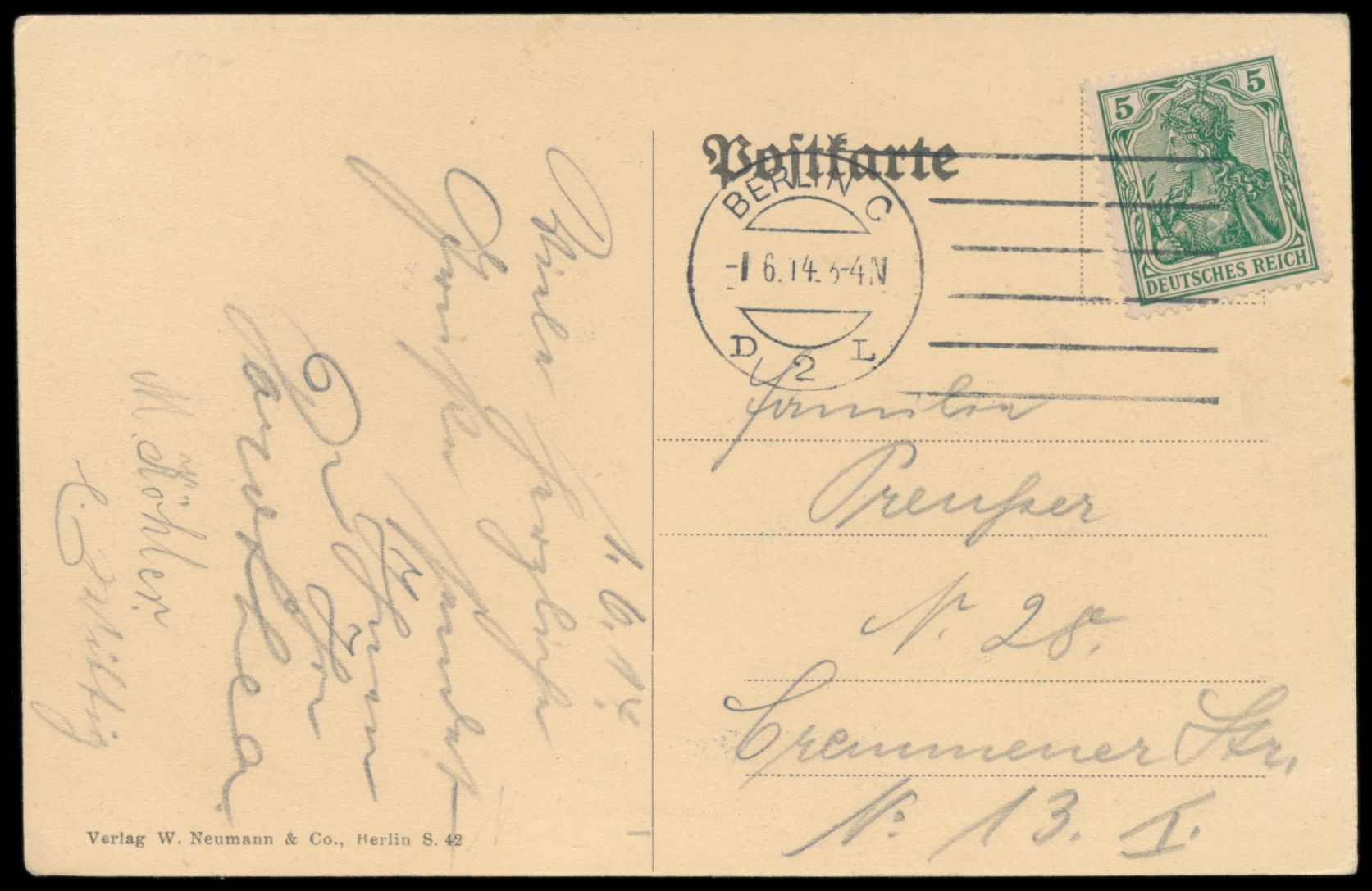 Michelius-Maschinenstempel Berlin C D 2 L 1.6.14 mit 6 Stichen auf Ansichtskarte mit 5 Pf.-Marke, Vorführmaschine, ab 13.3.1914 wegen technischer Probleme nur kurzzeitig eingesetzt und vom 27.5. bis 14.7.1914 durchgängig im Einsatz