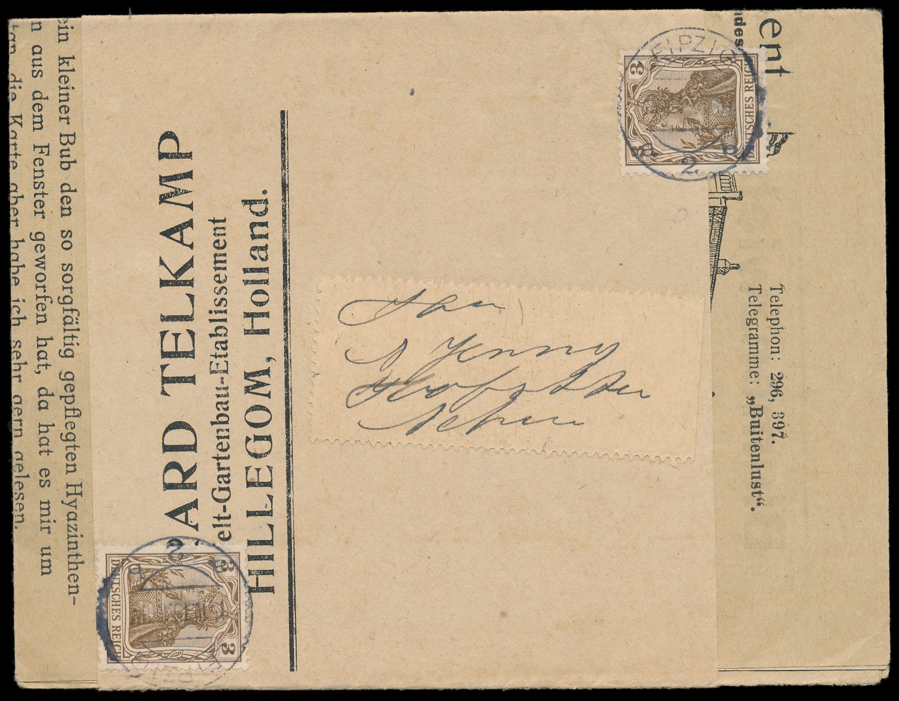 Streifband mit 2 x 3 Pf. mit DAPAG-Frankiermaschine Leipzig a 2 b 5.10.19 (rechts oben und links unten), Aufbrauch der 3 Pf.-Rollenmarken, bezahlt wurde nur das tarifmäßige Porto 5 Pf., Bedarf