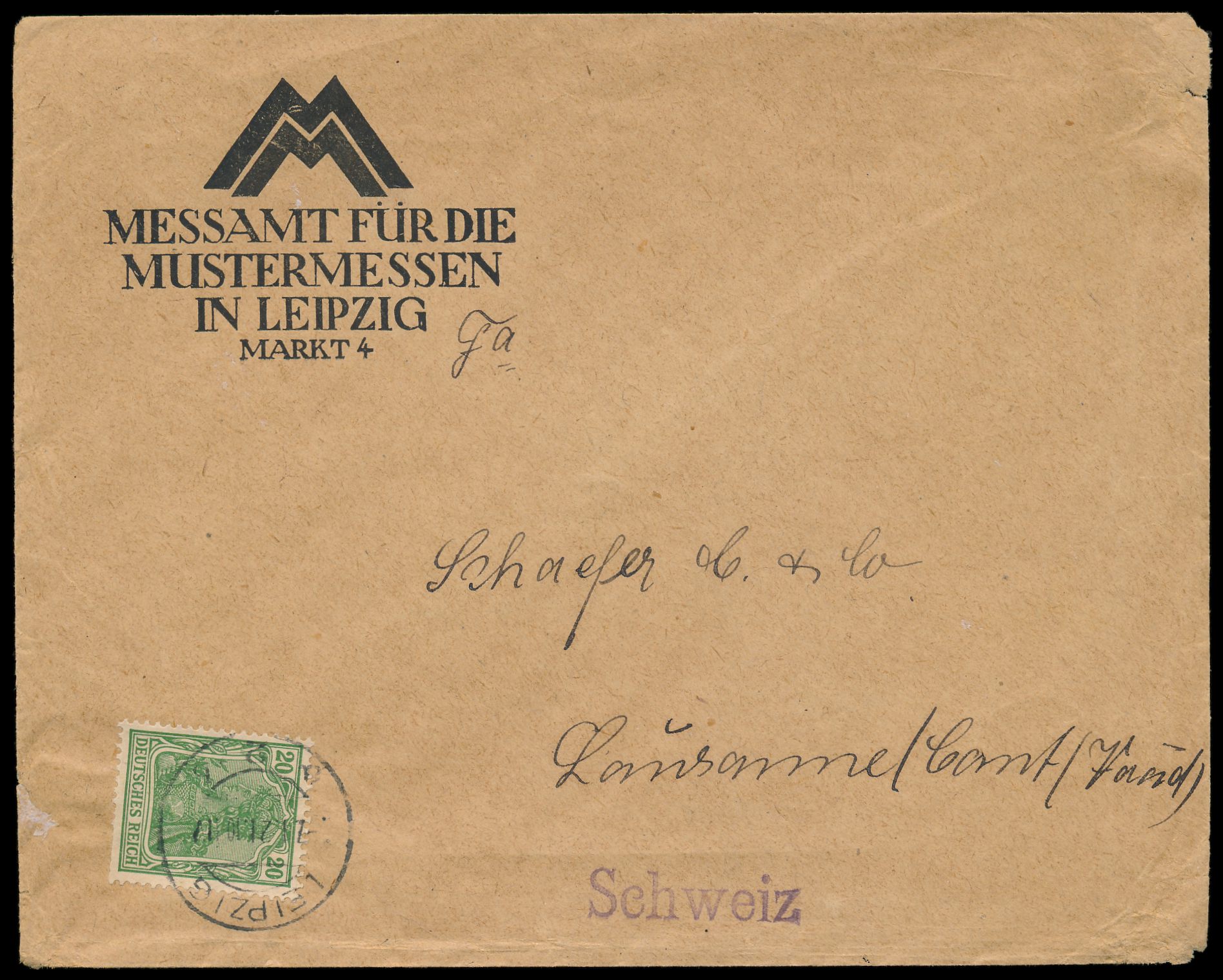 DAPAG-Frankiermaschine Leipzig a 2 b 7.1.21 mit 20 Pf. grün (kleine Zahnfehler, Rollenmarkenzähnung) auf Auslandsdrucksache der Leipziger Mustermesse in die Schweiz, seltene Einzelfrankatur, portorichtig, Bedarf