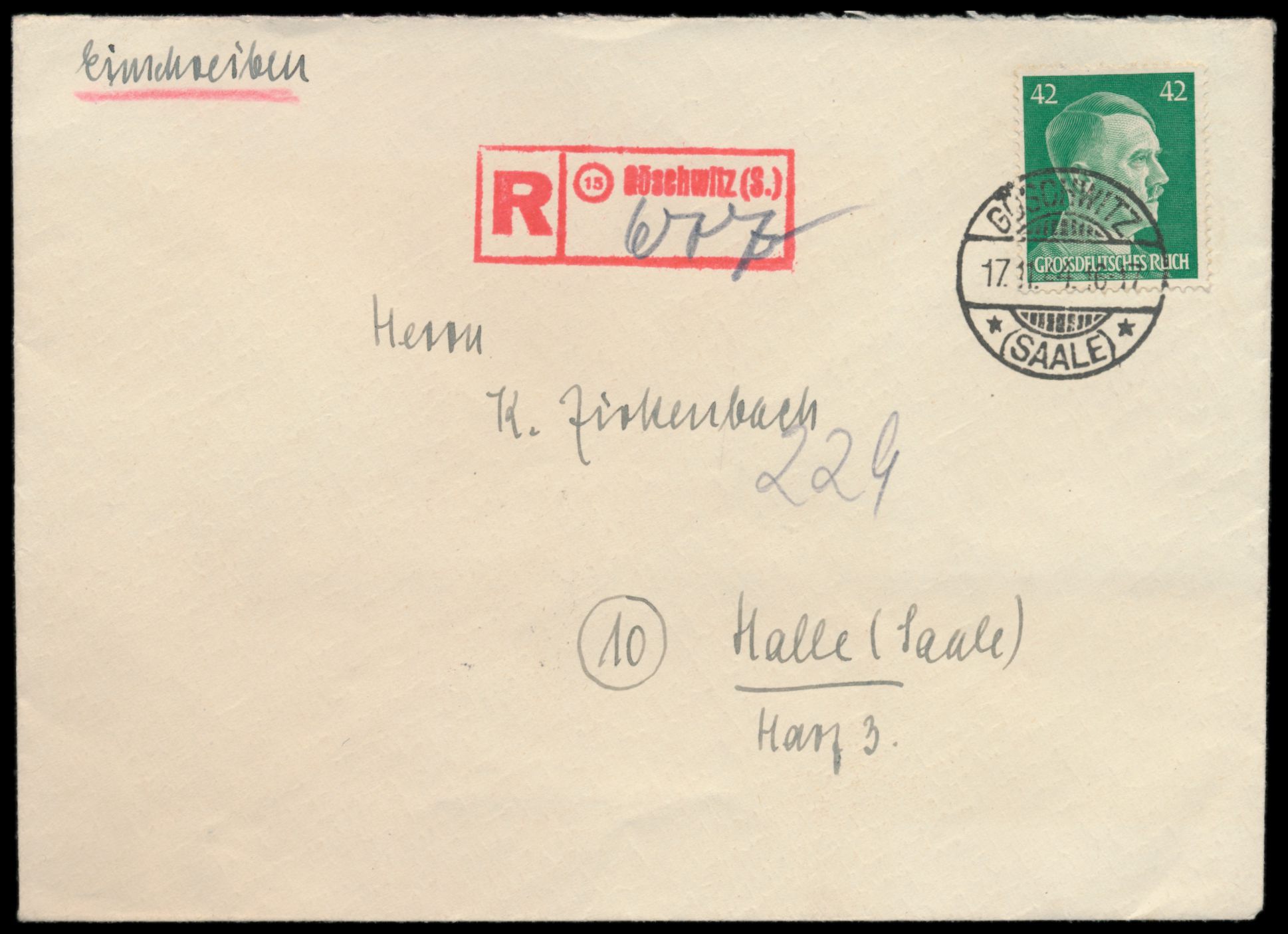 Einschreibbrief mit Einzelfrankatur 42 Pf., Gitterstempel Göschwitz (Saale) 17.11.44, roter R-Stempel mit PLGZ (15) Göschwitz (S.) , im Schnellbacher-Katalog nicht aufgeführt (bisher nur von Jena bekannt), nach Halle, undeutlicher Ankunftstempel