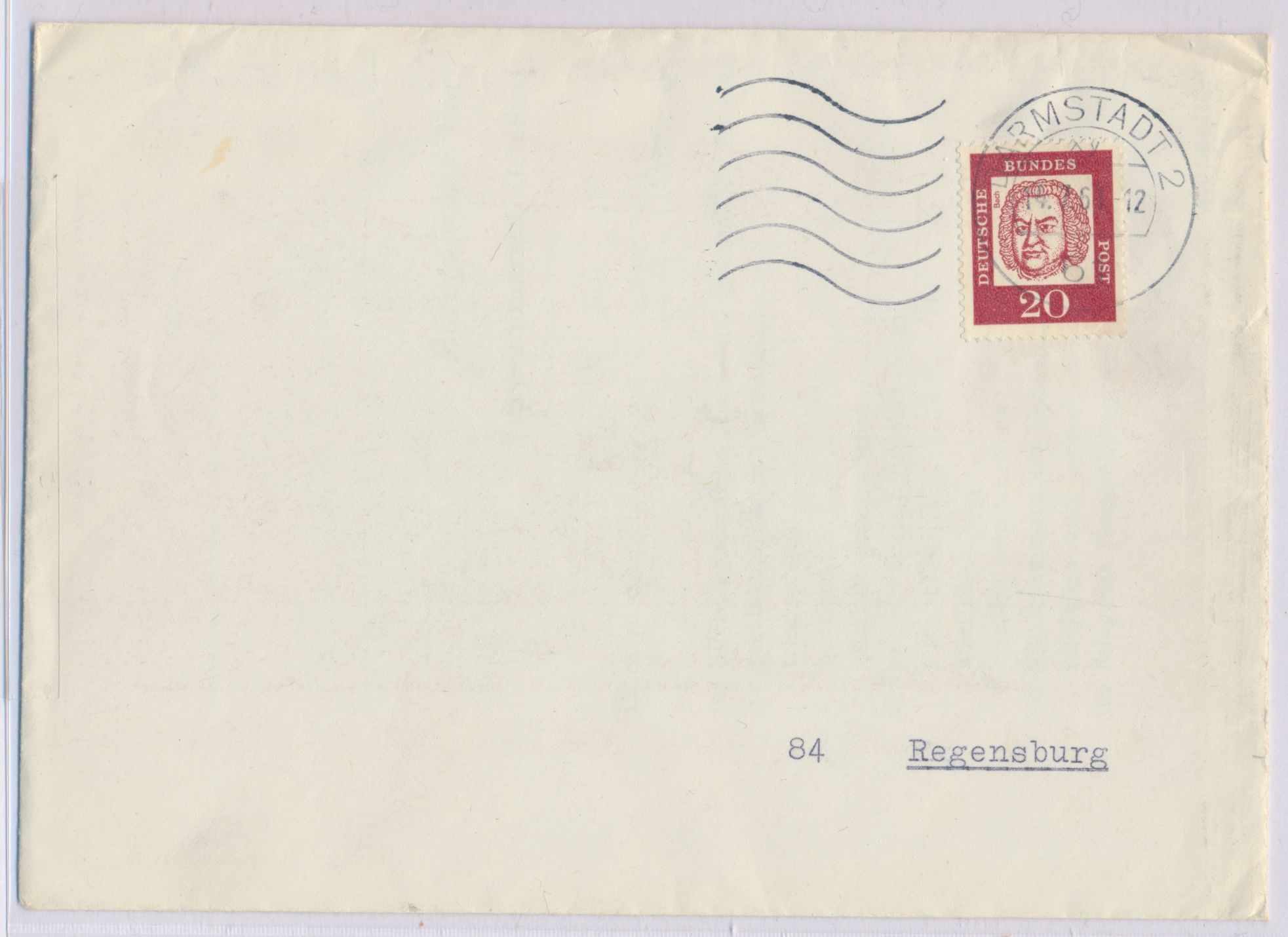 20 Pf. Bach auf Versuchsbrief mit Maschinenstempel Darmstadt 2 14.7.61, Umschlag mit Inhalt, ungeöffnet