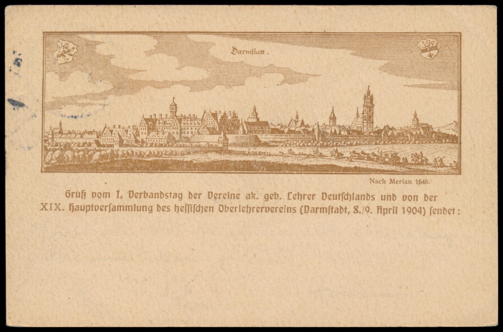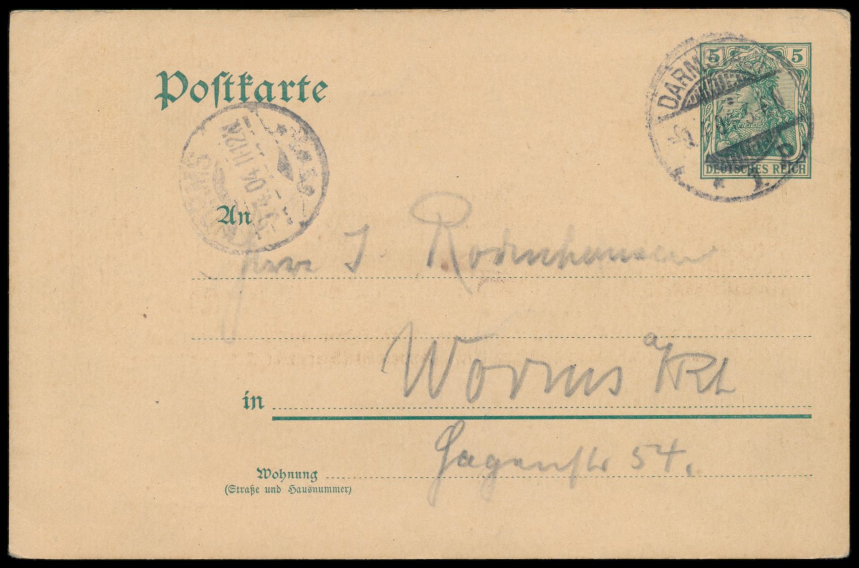 Ganzsache 5 Pf. mit Zudruck I. Verbandstag der Vereine ak. geb. Lehrer Deutschlands ... Darmstadt 8. / 9. April 1904, Frech C 44 (Z), Stempel Darmstadt 9.4.04, nach Worms, Ankunftstempel 9.4.04