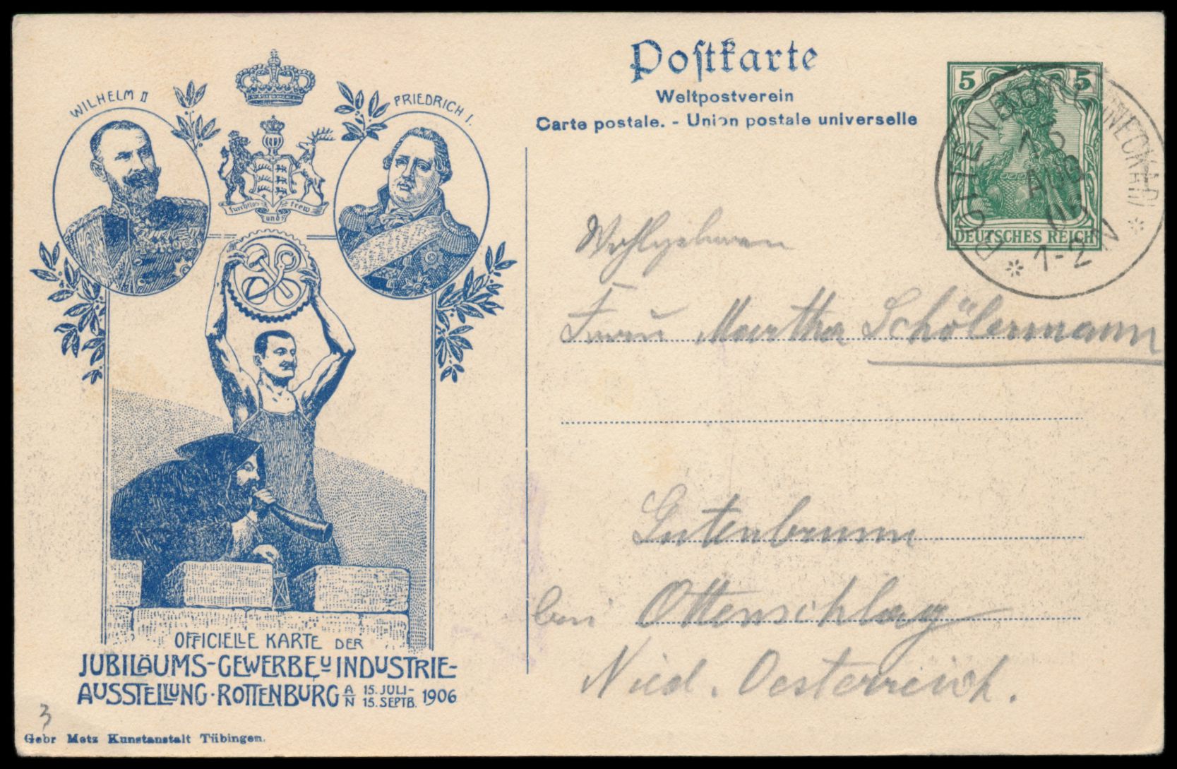 Privatganzsache 5 Pf., Rottenburg a. Neckar - Jubiläums-Gewerbe- u. Industrie-Ausstellung, Frech C 67 / 09, Stempel Rottenburg (Neckar) 13.8.06, nach Österreich, Bedarf