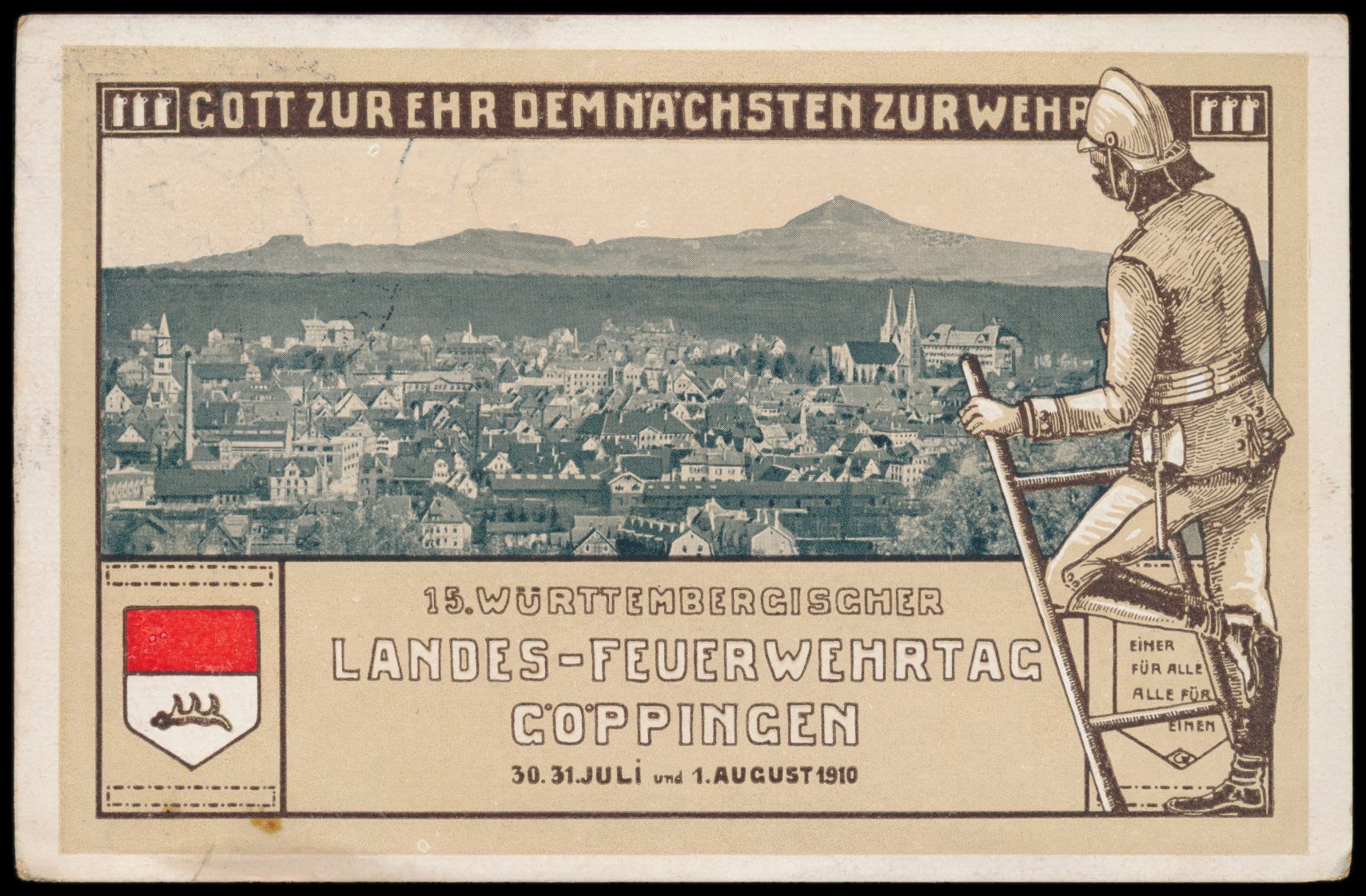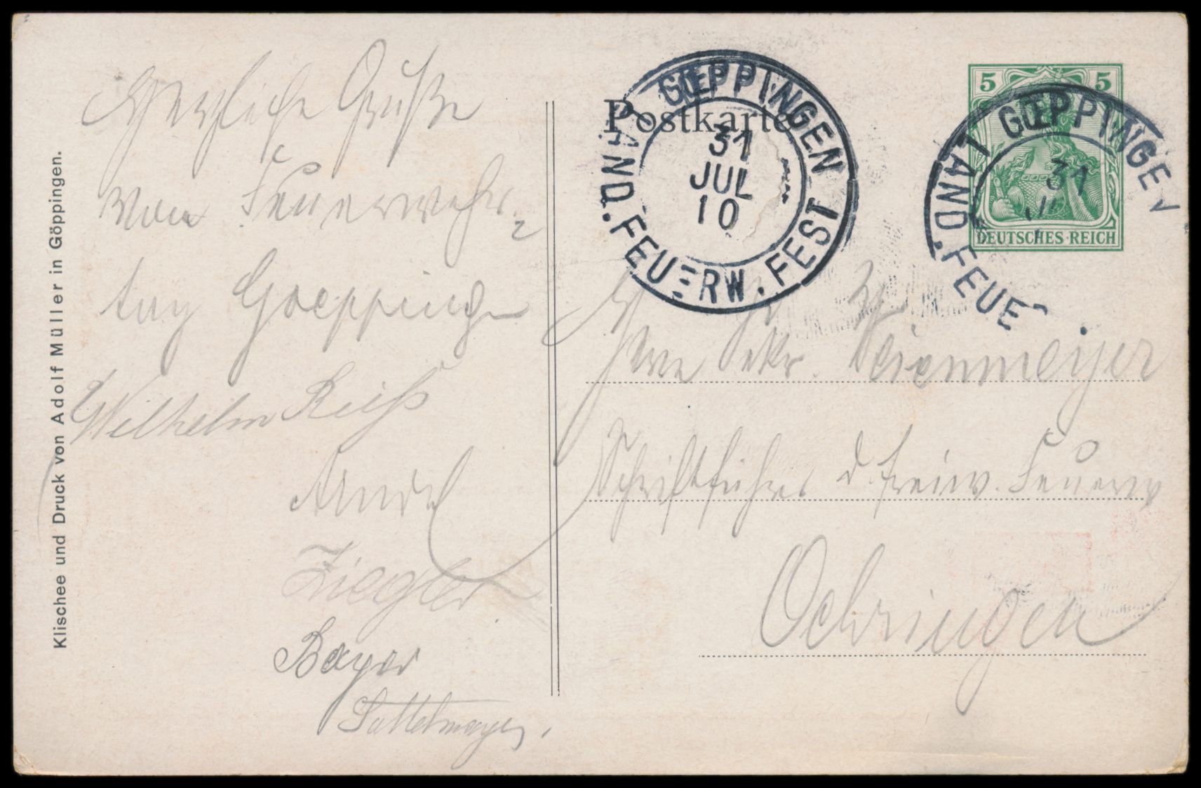 Göppingen, 15. Württembergischer Landes-Feuerwehrtag, Wertstempel 5 Pf.. Bilduntergrund gelbbraun, Frech C 115 / 01, Sonderstempel Goeppingen Land. Feuerw. Fest 31. Jul. 10 (Wanderstempel-Type), nach Öhringen, leichte Beförderungsspuren, Bedarf