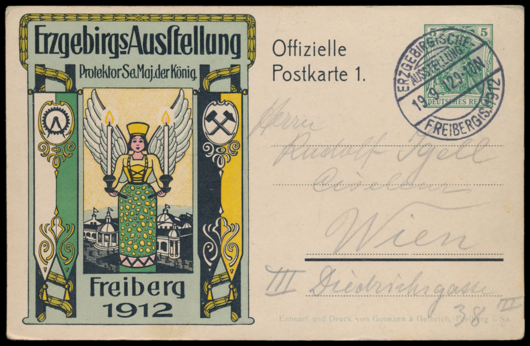 Privatganzsache 5 Pf., Erzgebirgs-Ausstellung Freiberg 1912, Offizielle Postkarte 1., Frech C 148 / 01, passender Sonderstempel Freiberg 19.9.12, nach Wien, Bedarf