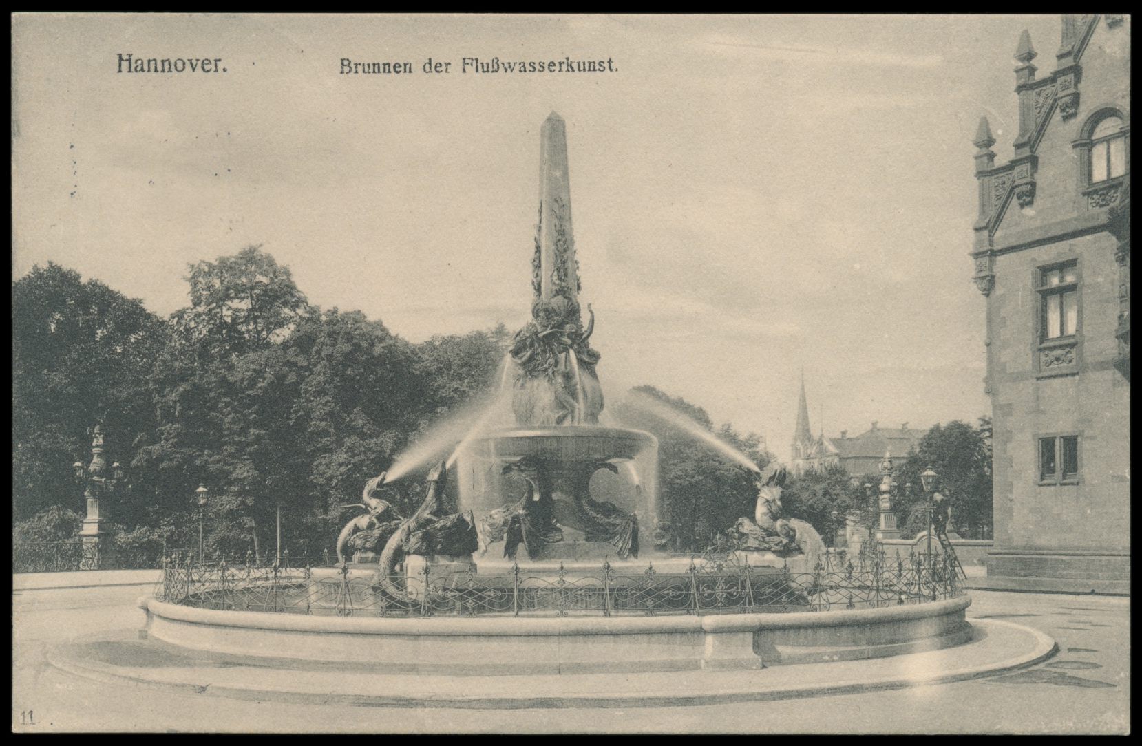 Privatganzsache 5 Pf., Fest-Postkarte zum XXV. Deutschen Philatelisten-Tag ..., Ansicht Hannover - Brunnen der Flußwasserkunst, Frech C 198 / 02, Sonderstempel Hannover 1 XXV. Deutscher Philatelistentag 18.8.13 , Ortskarte