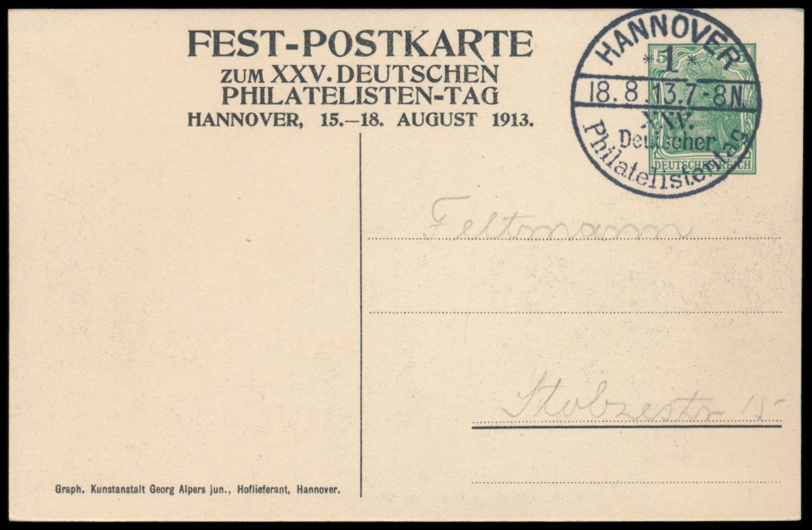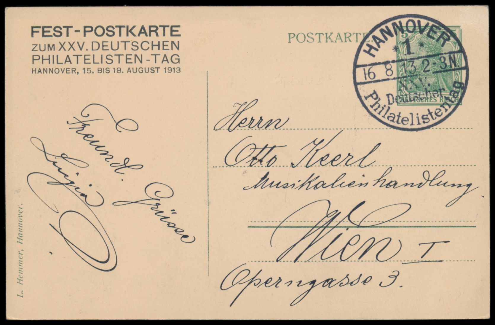 Privatganzsache 5 Pf., Fest-Postkarte zum XXV. Deutschen Philatelisten-Tag ..., seltene Ansicht Hannover-Herrenhausen Palmenhaus, Frech C 198 / 07, Sonderstempel Hannover 1 XXV. Deutscher Philatelistentag 16.8.13, nach Wien