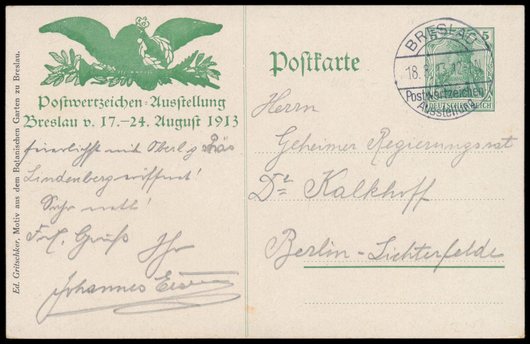 Privatganzsache 5 Pf., Postwertzeichen-Ausstellung Breslau ..., rückseitig Bild Botanischer Garten, Frech PP 27 / C 199, Sonderstempel Breslau Postwertzeichen-Ausstellung 18.8.13, nach Berlin, Bedarf