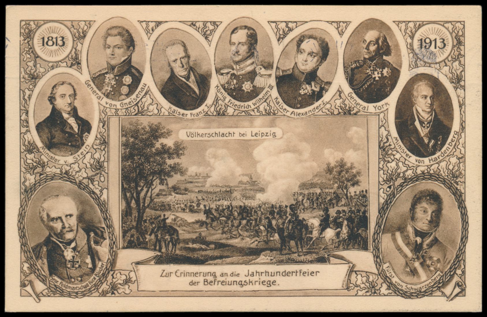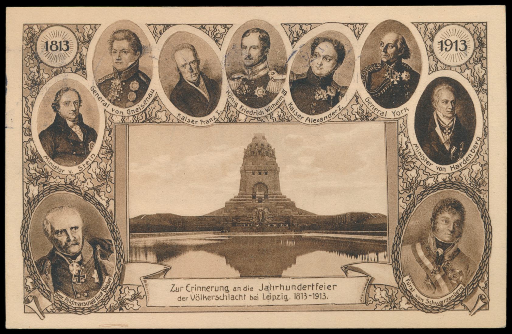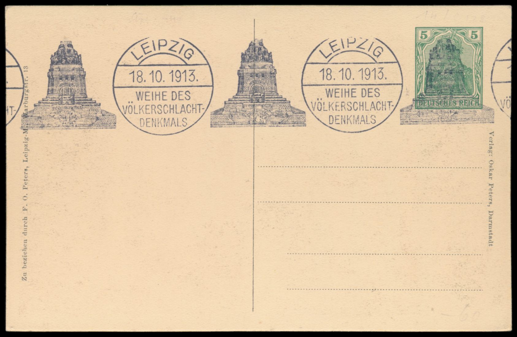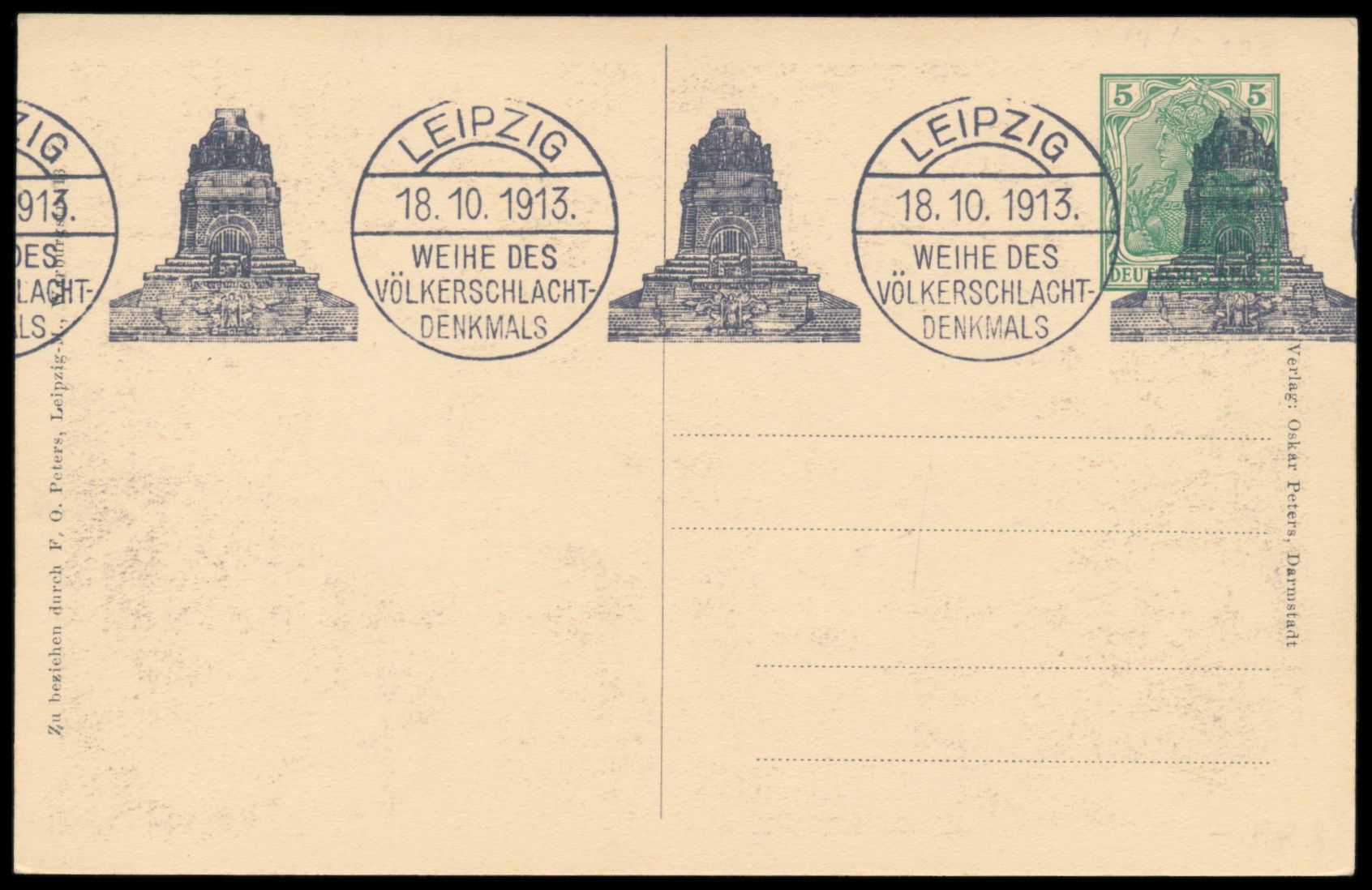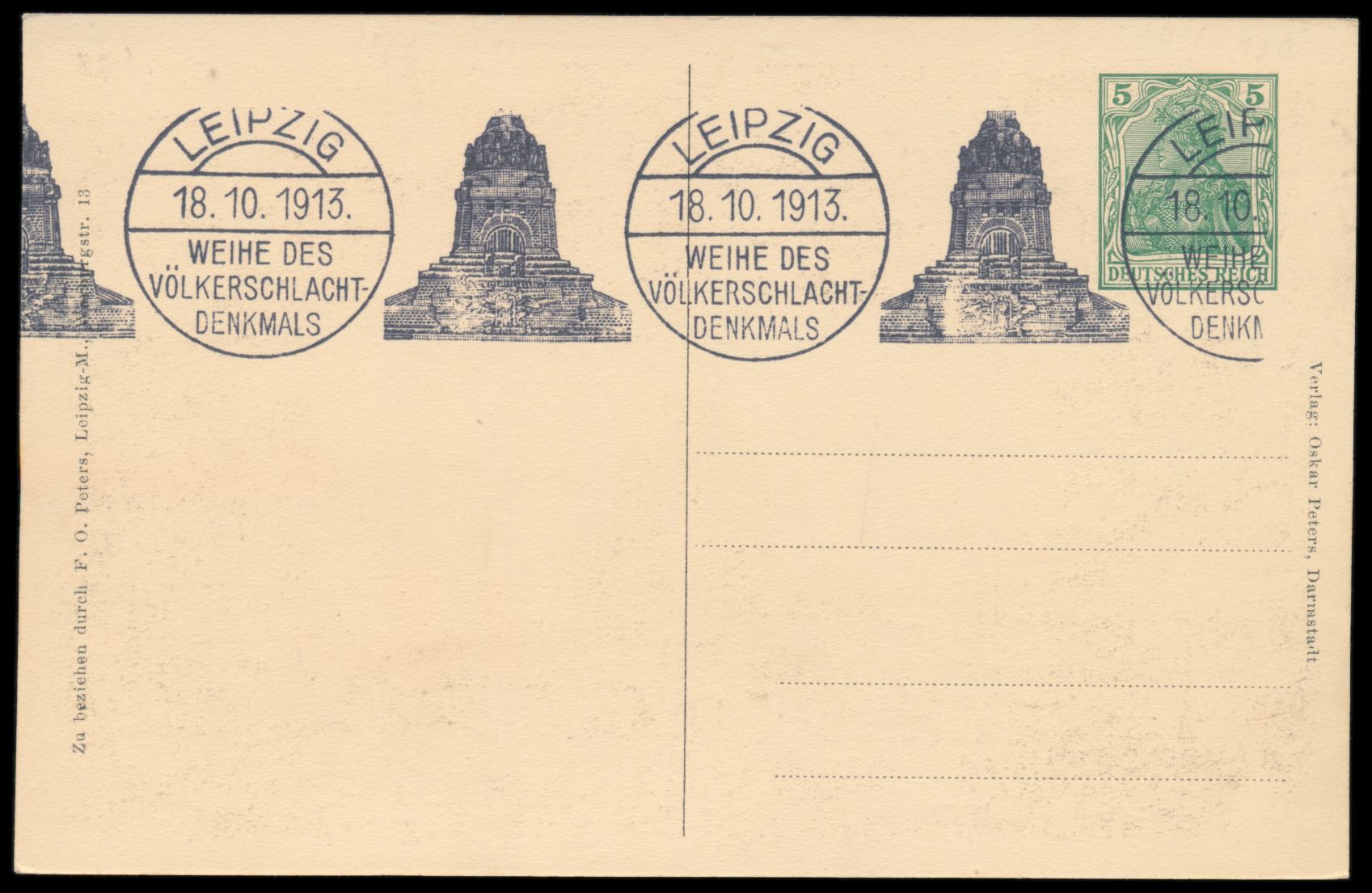 Privatganzsache 5 Pf., Leipzig, Jahrhundertfeier der Völkerschlacht, kompletter Satz von drei Karten, Bilder Völkerschlachtdenkmal und Erstürmung des Grimma´er Tores, Frech C 219 / 01, 02, 03, alle Blanko-Maschinen-Sonderstempel Leipzig 18.10.13