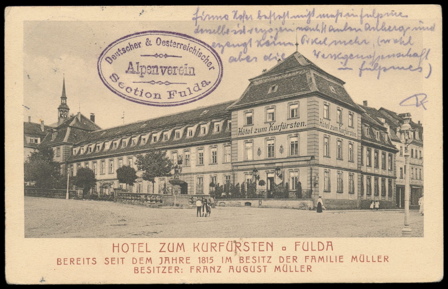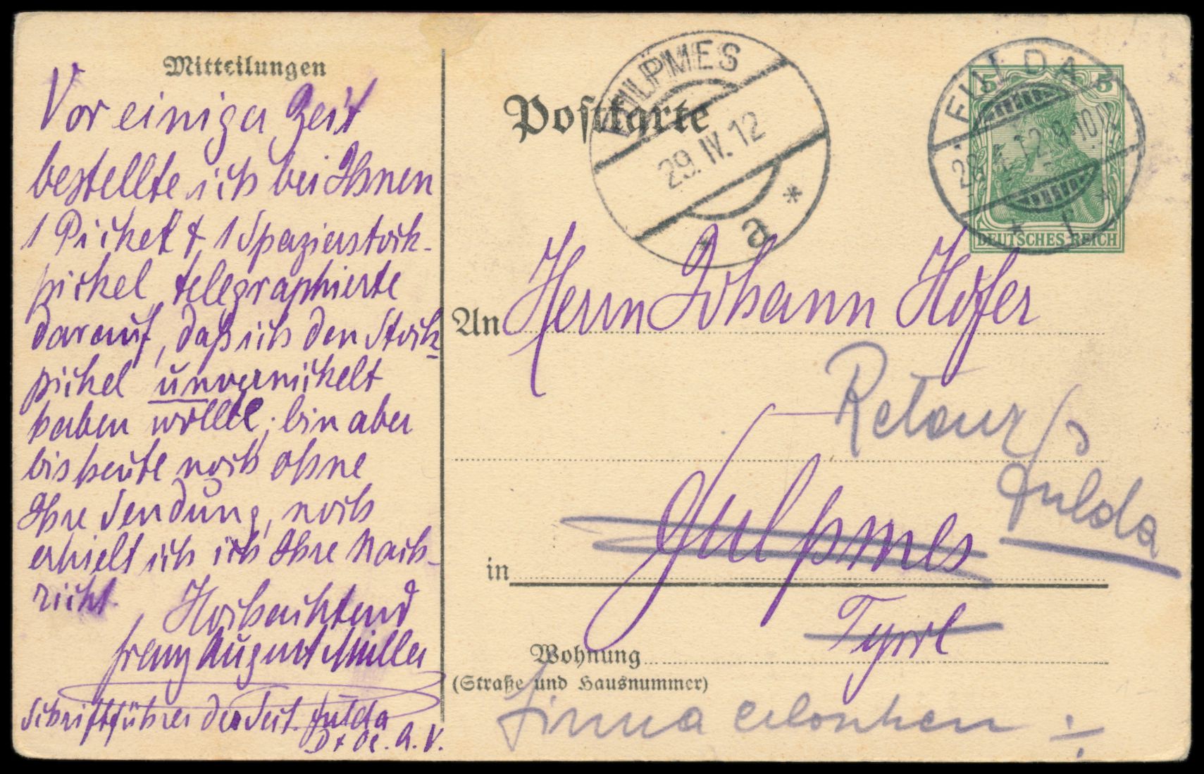 Privatganzsache 5 Pf., Fulda - Hotel zum Kurfürsten, Frech F 19, Stempel Fulda 28.4.12 nach Fulpmes / Österreich, am 29.4.12. mit Stempel Fulpmes zurück nach Fulda, Bedarf